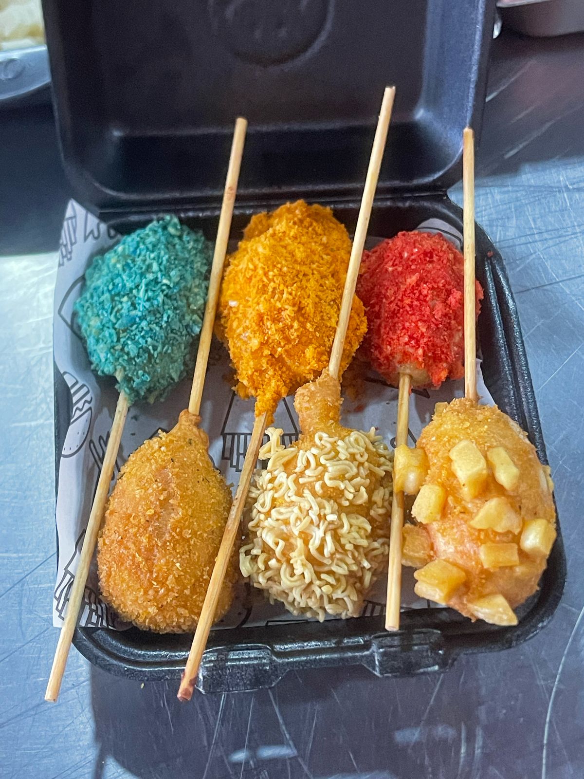 Banderilla de salchicha con cobertura de sabor de tu elección, aderezo.