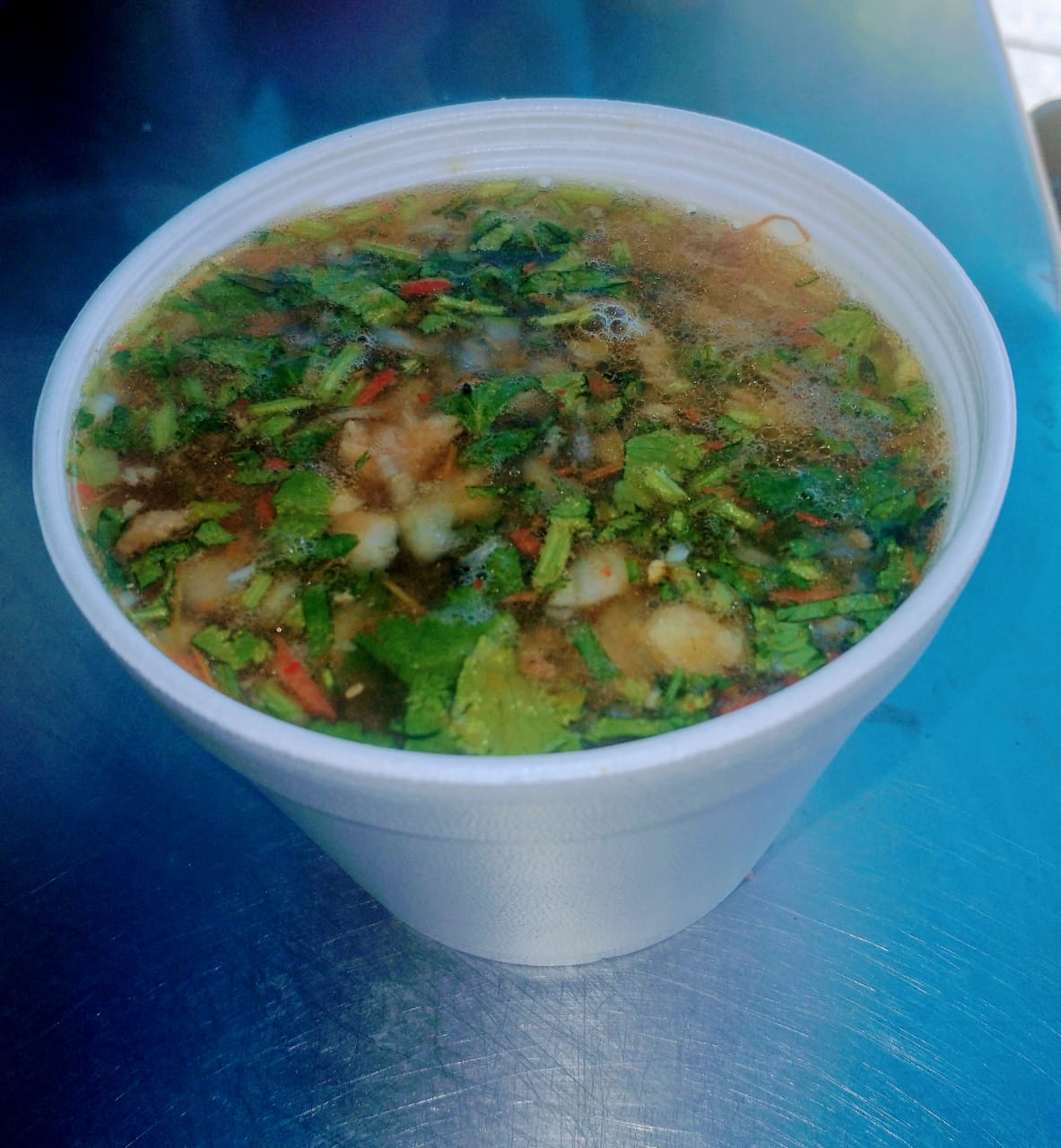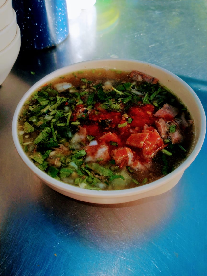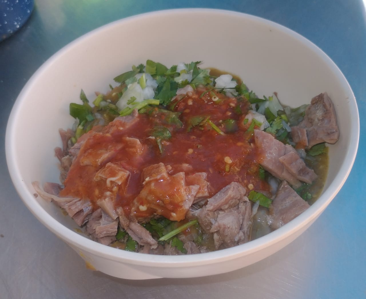 Medio litro de consomé con 100 gr de birria, acompañada de verduras, cebolla y cilantro, limones, salsa verde caliente y salsa roja picante y tortillas calientitas.