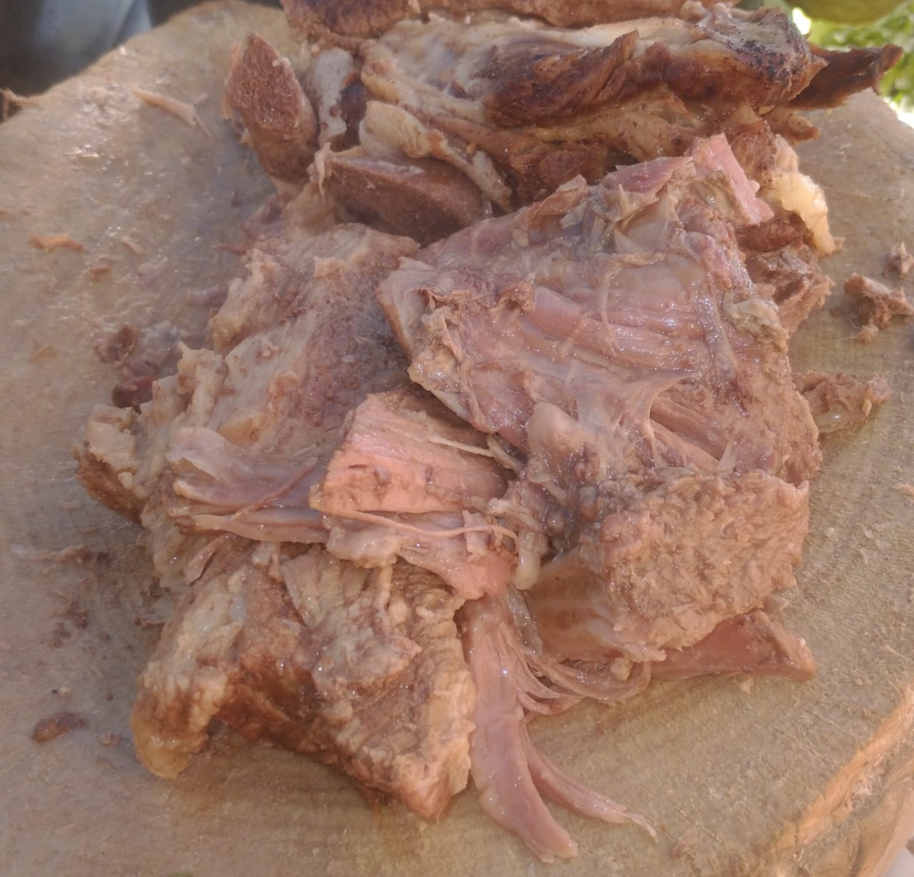 1 kg de birria pesada en trozo y picada en seco acompañada de verdura cebolla y cilantro, limones, salsa verde caliente y salsa roja picante, tortillas calientitas y rico consomé aparte.