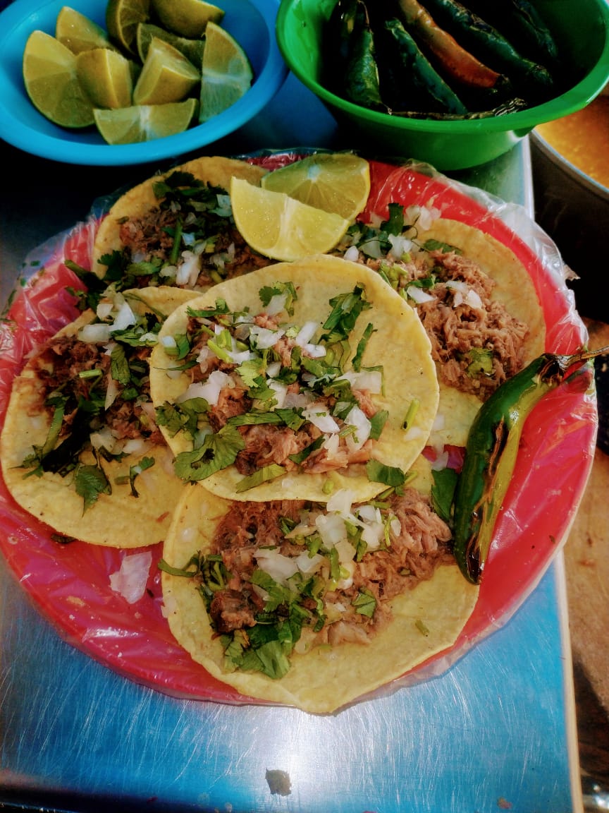 5 tacos de doble tortilla chica, acompañados de verdura, cebolla y cilantro, limones, salsa verde caliente y salsa roja picante
