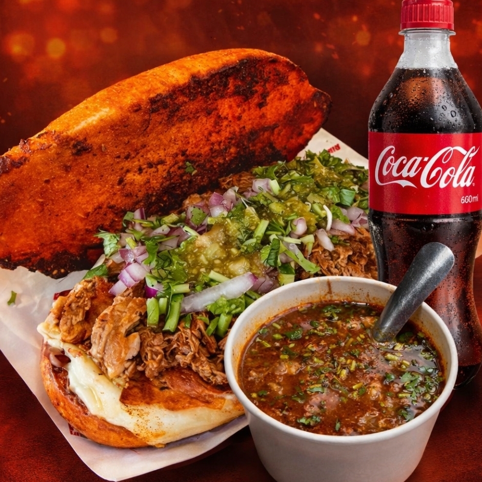 Consomé 8oz*1 + Torta de Borrego*1 + Coca cola orignal 450 ml*1