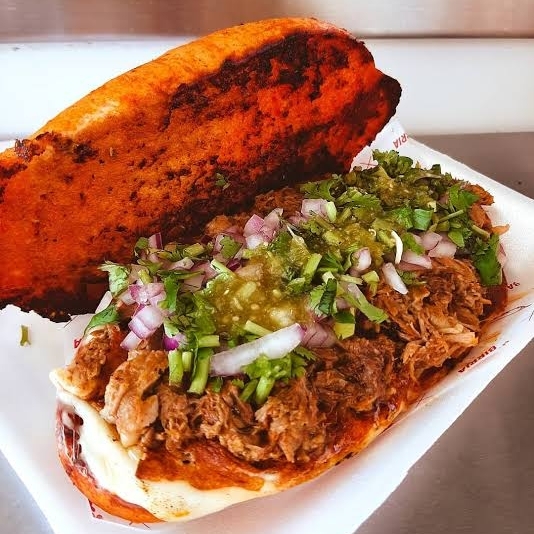 Tentadora torta rellena de birria de res con queso asadero gratinado al comal.