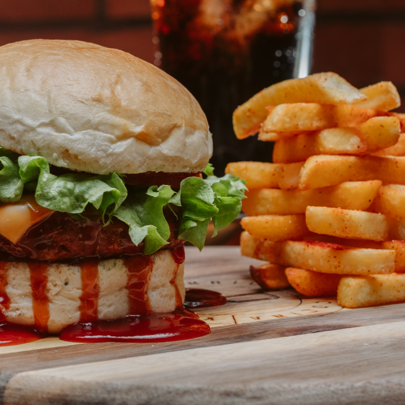130g de carne de cerdo barnizada en la salsa de tu preferencia, en pan brioche acompañada de queso amarillo, jitomate, lechuga y papas a la francesa.