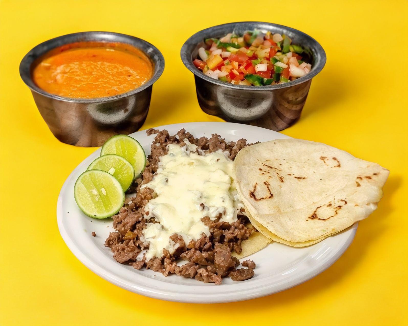 Porción de bistec con queso, tortilla, cebolla asada, chile asado, limón y salsa.