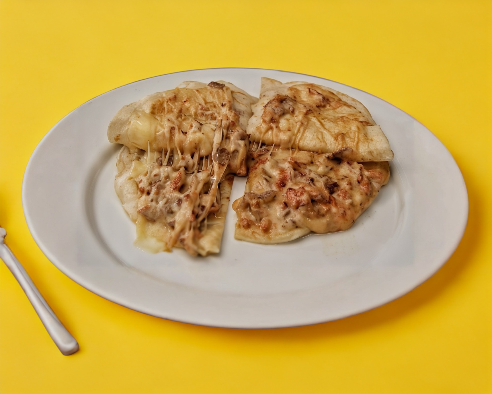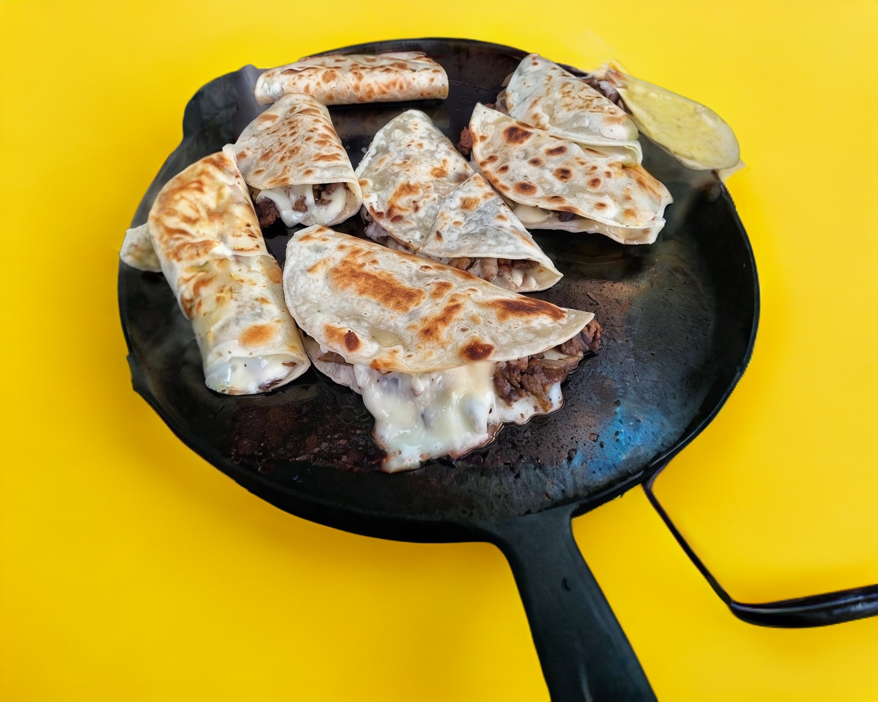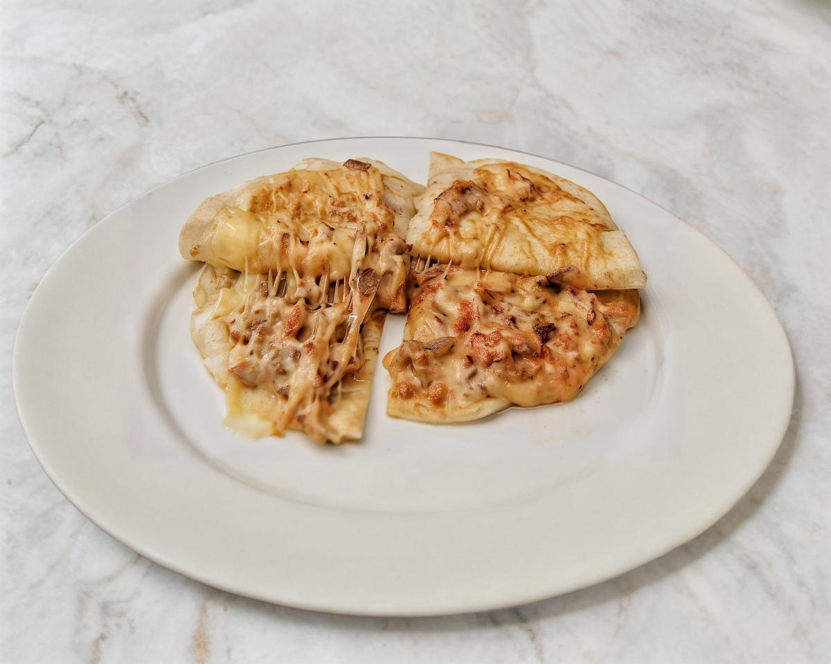 Tortilla de harina grande, queso chihuahua y carne al pastor.
