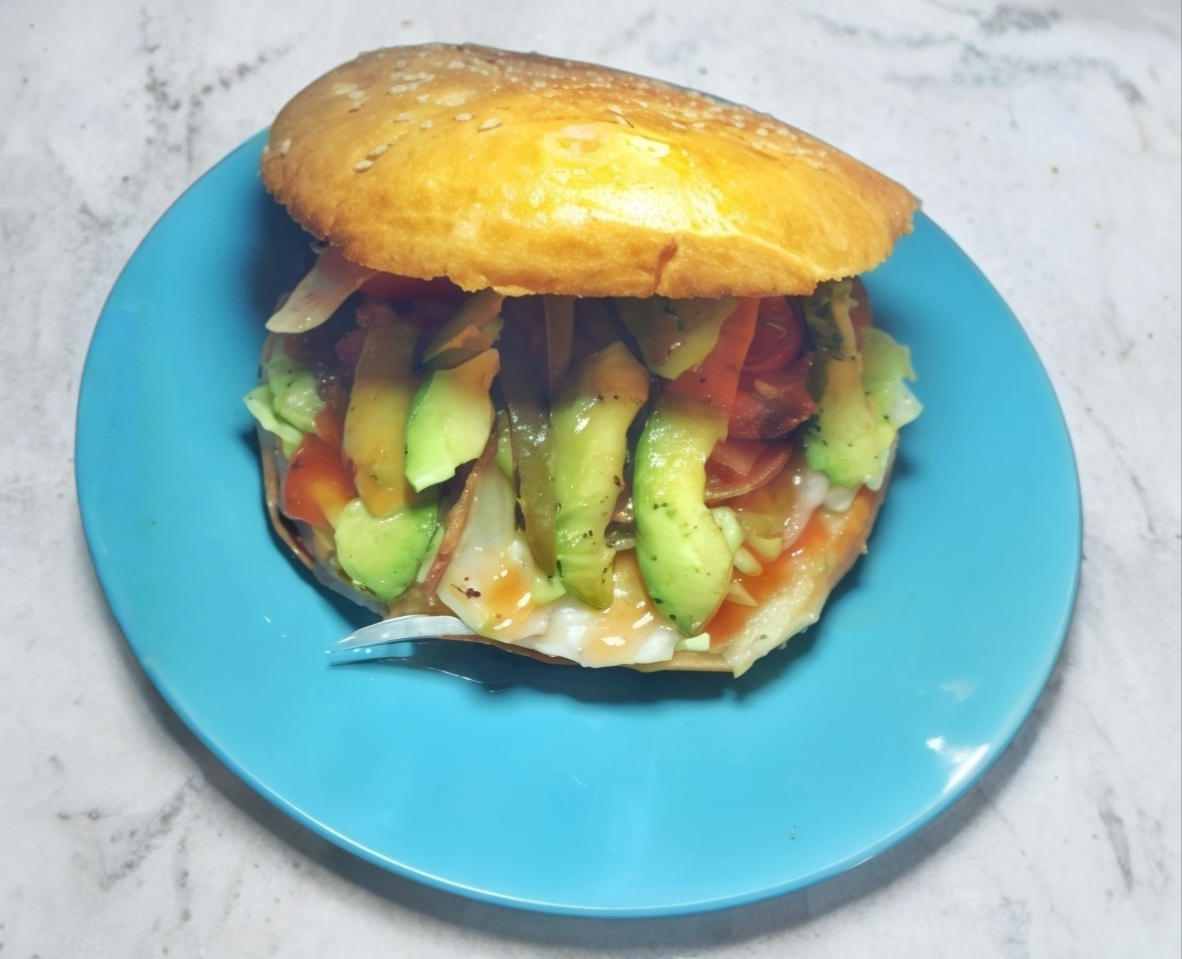 Carne de res, jamón, queso manchego, aguacate, salchicha de pavo, lechuga, cebolla asada y verdura.