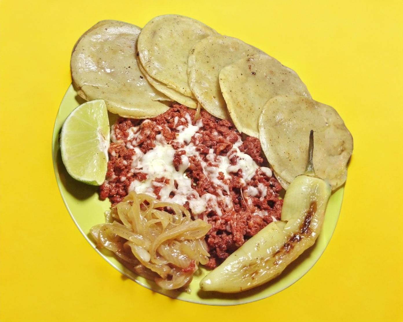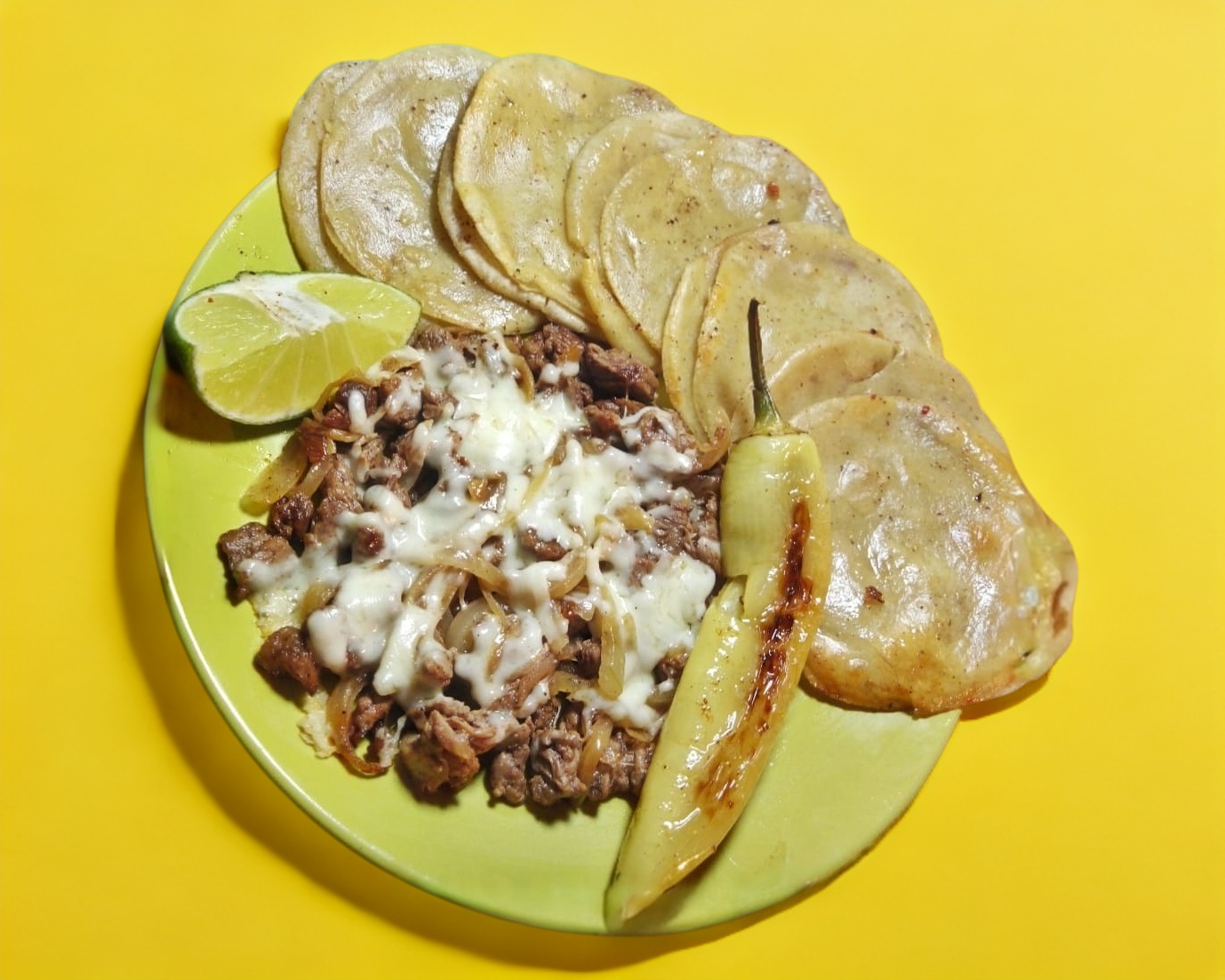 Carne de arrachera con queso, tortillas cebolla asada chile asado limon y salsa.
