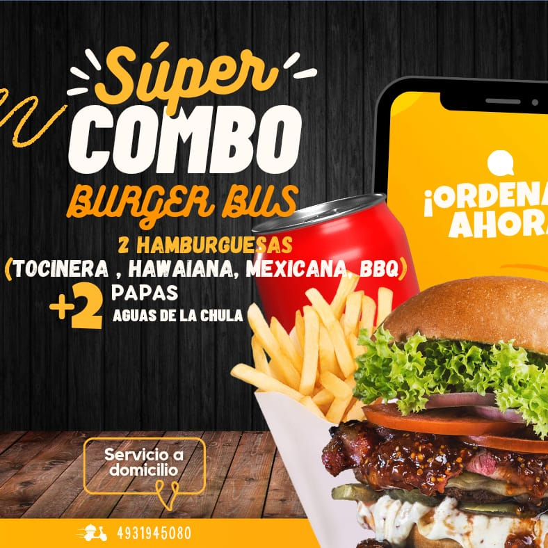 Super Combo que incluye 2 hamburguesas de tu elección, 2 Medias Ordenes de Papas y 2 Aguas la Chula de jerez 500 ml. sabor variado
