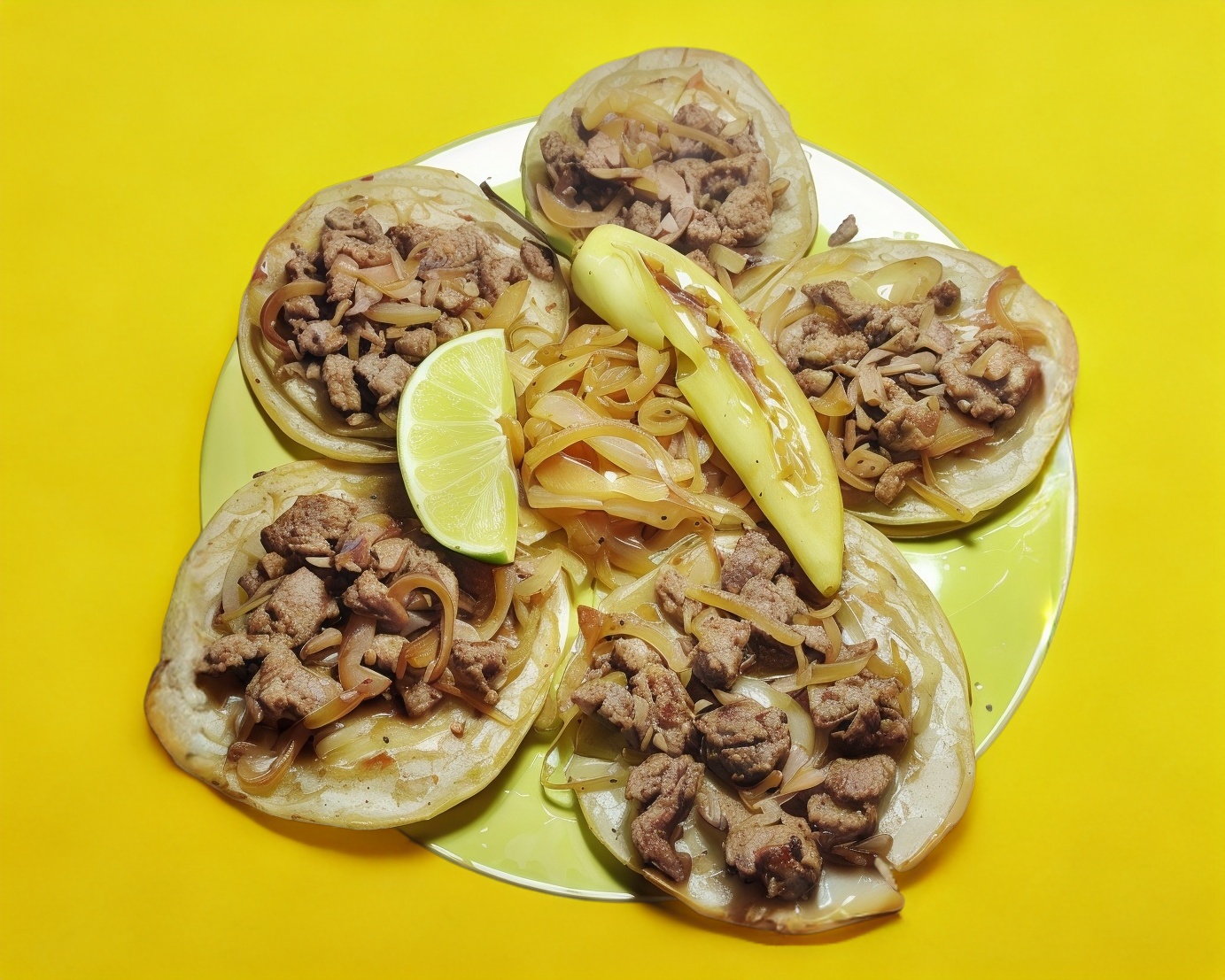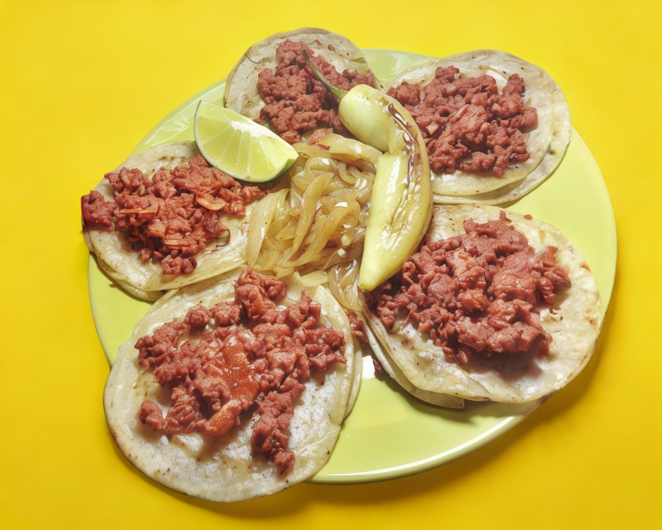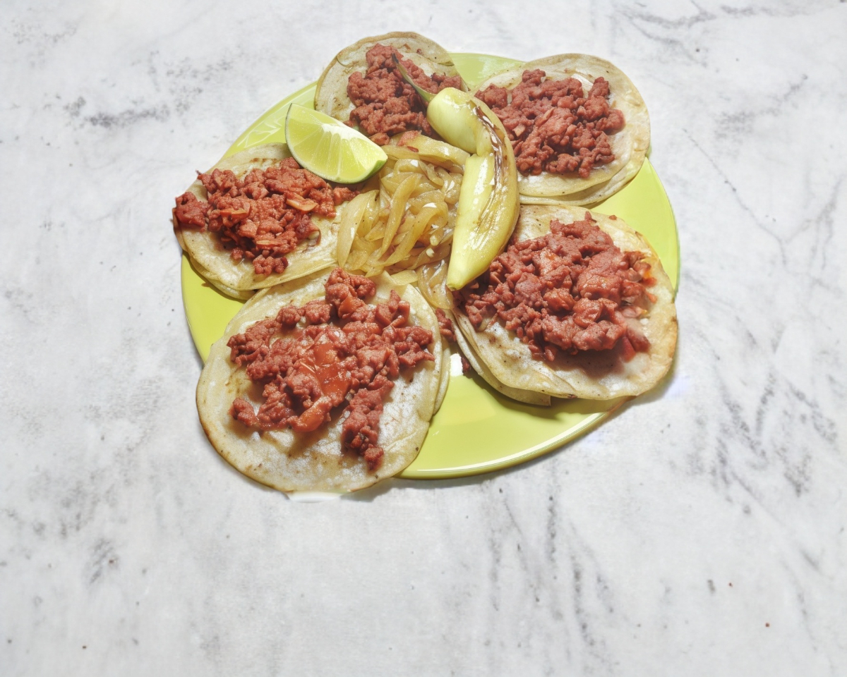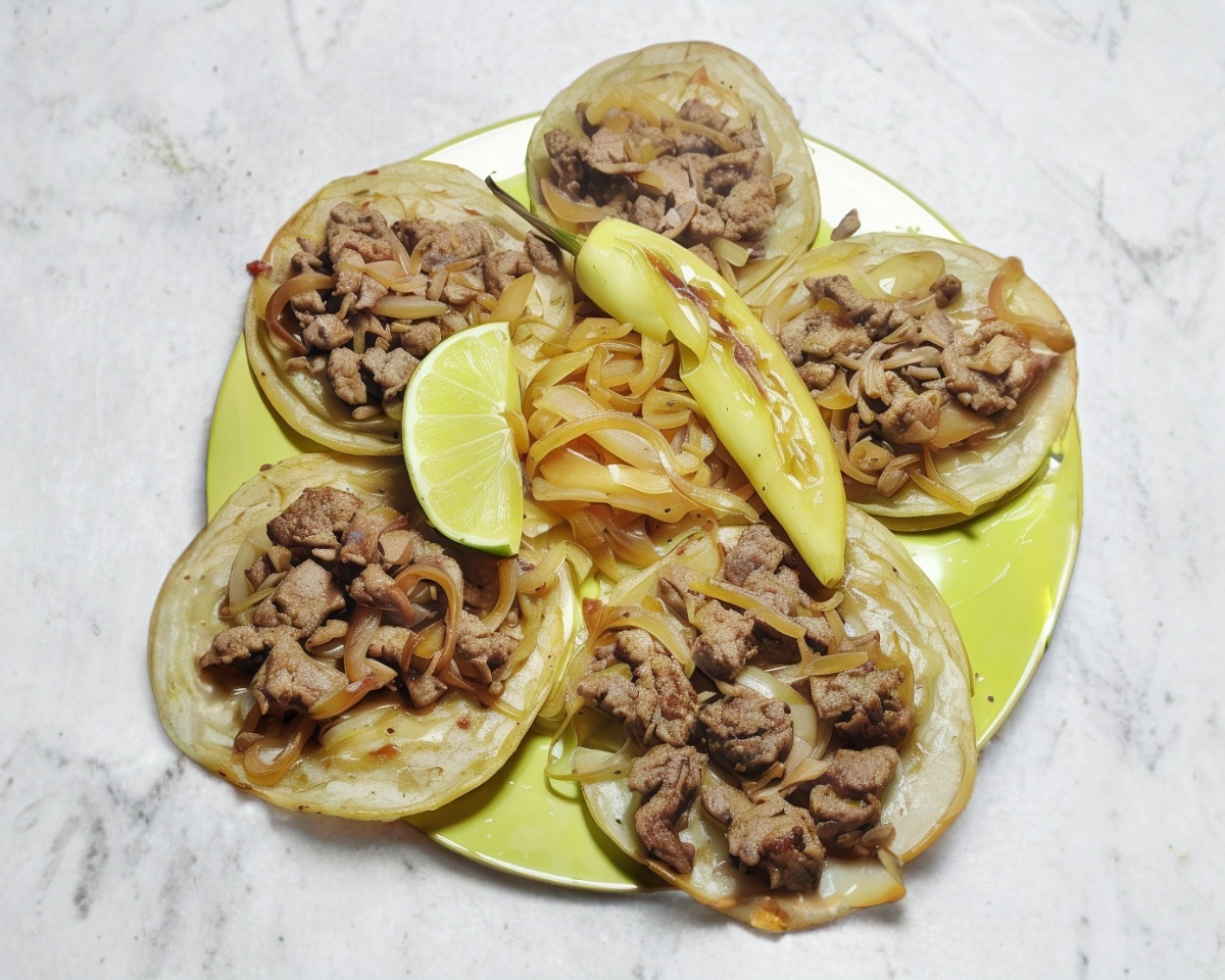 5 Tacos con tortilla doble, cebolla asada, chile asado, limón y salsa.
