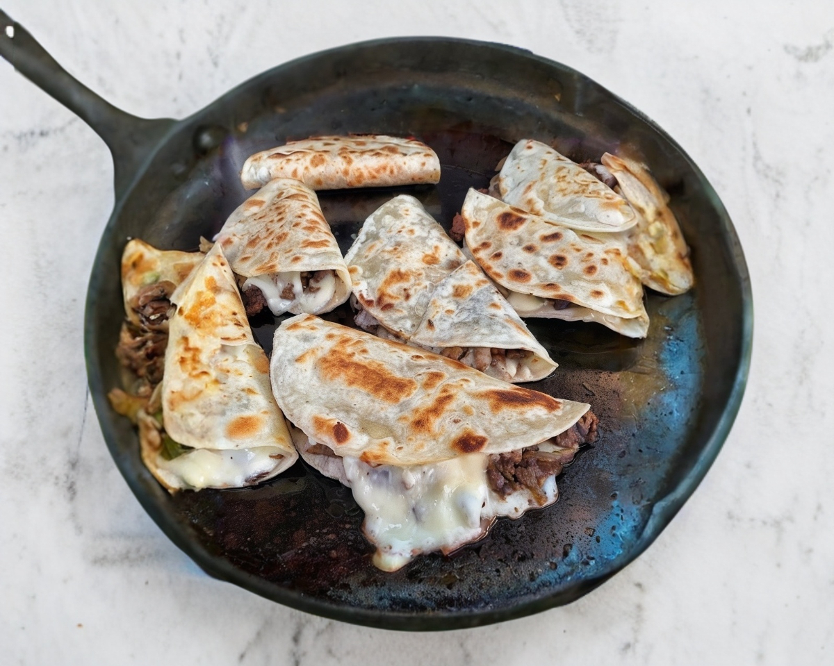Tortilla de harina grande, queso chihuahua y carne de bistec.