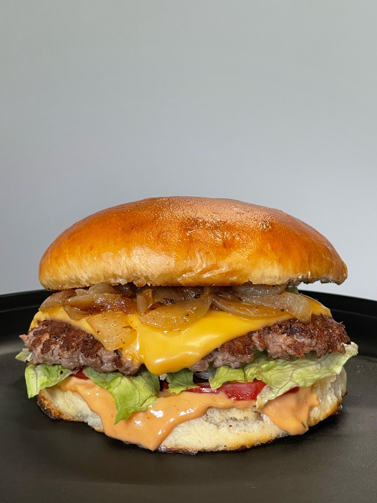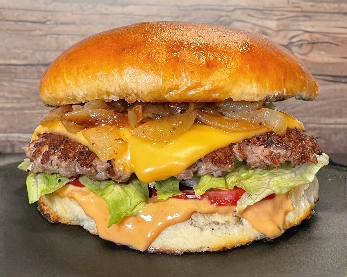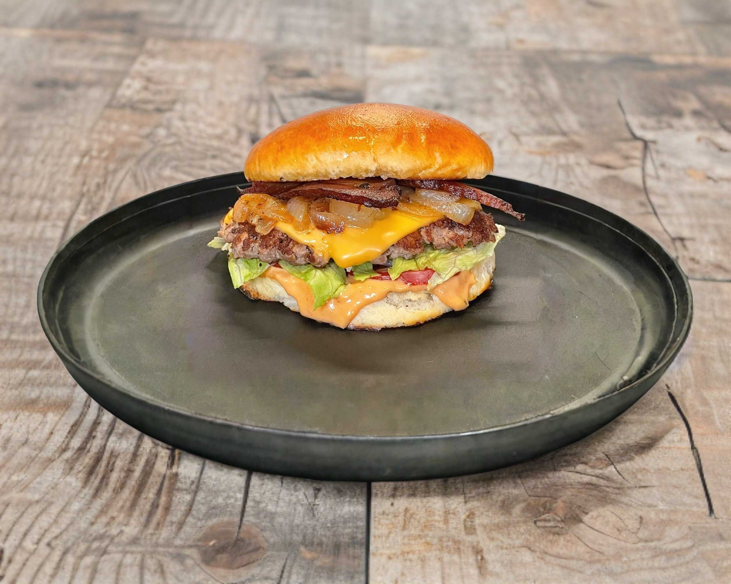 160 g De carne, doble queso, doble aderezo de la casa, cebolla caramelizada, jitomate, lechuga y pan brioche. Acompañada de chiles güeros.