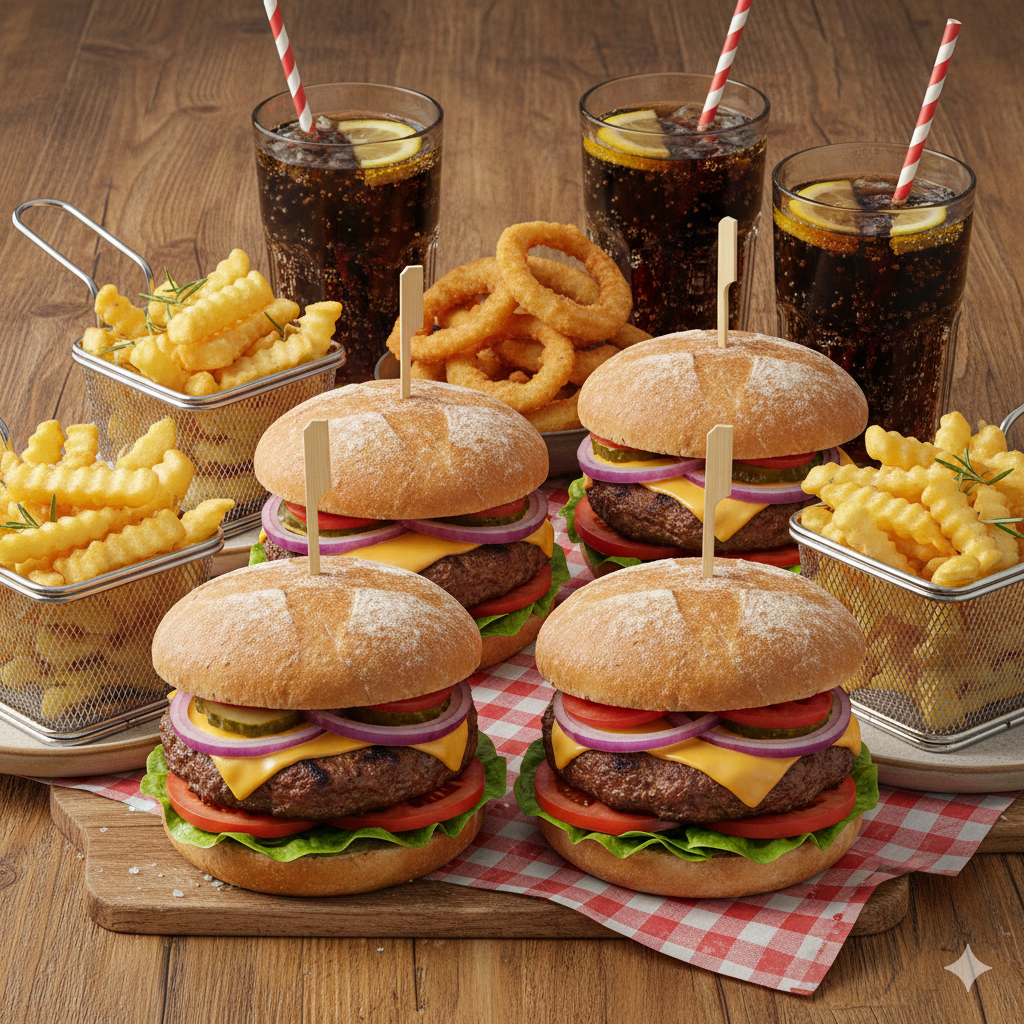 Burger Sports Clásica.*4 + Papas a la Francesa 220 G.*4 + Aros de Cebolla.*2 + Coca Cola Original 450ml*4