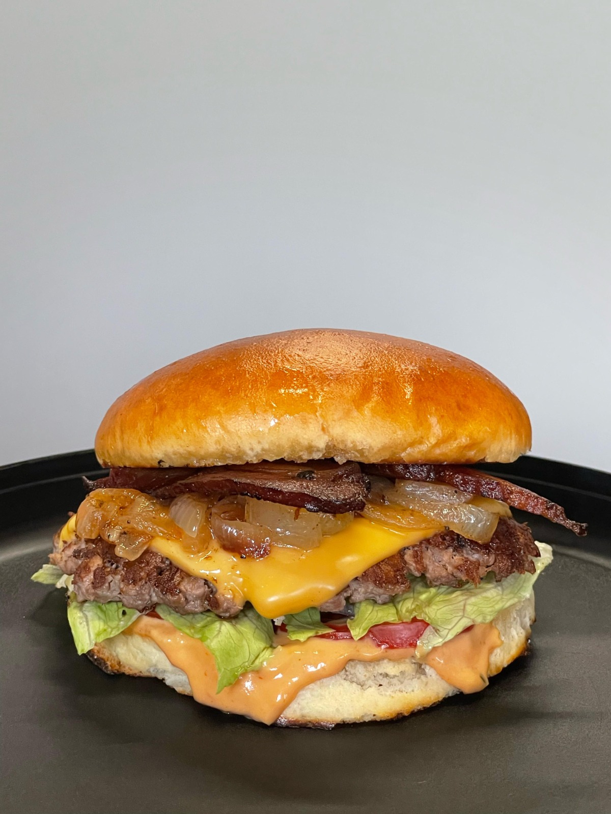 Tocino, cebolla caramelizada, queso americano, 80 g de carne, aderezo de la casa, jitomate, lechuga y pan brioche. Acompañada de chiles güeros.