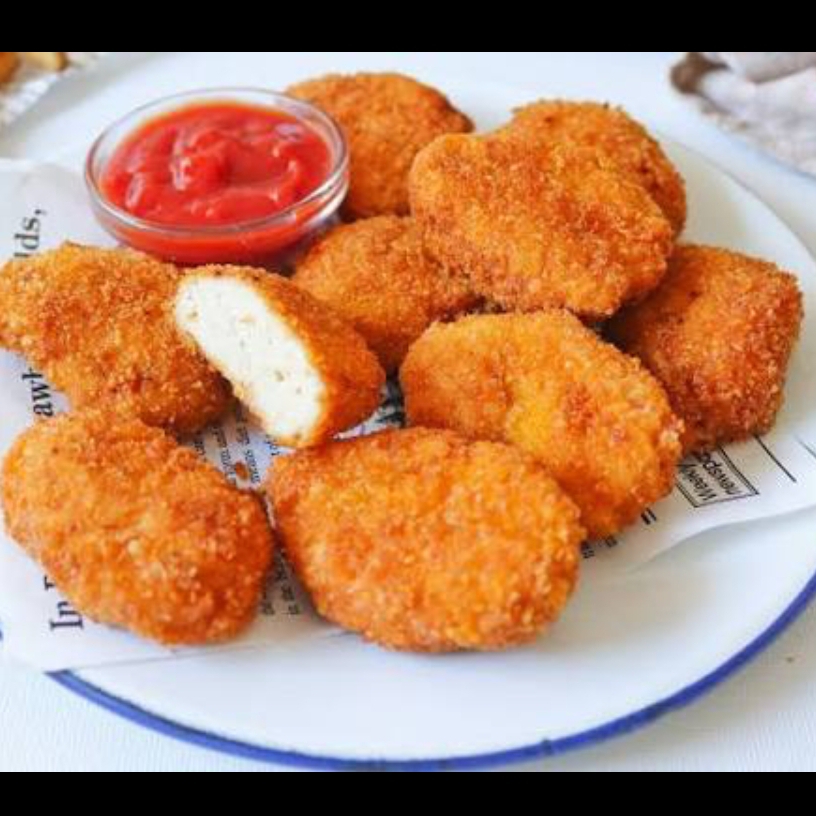 Porción de nuggets de pollo dorados y crujientes.