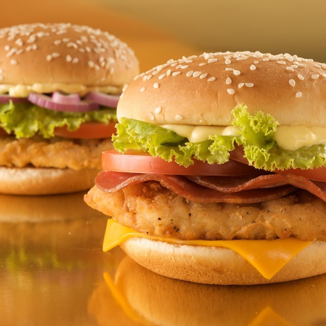 Hamburguesa de milanesa de pollo empanizada con queso amarillo, lechuga, jitomate y cebolla.