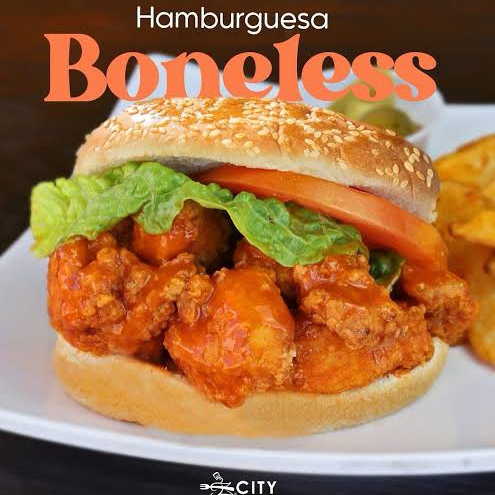 Innovadora hamburguesa rellena de boneless, queso amarillo y vegetales frescos con aderezos.