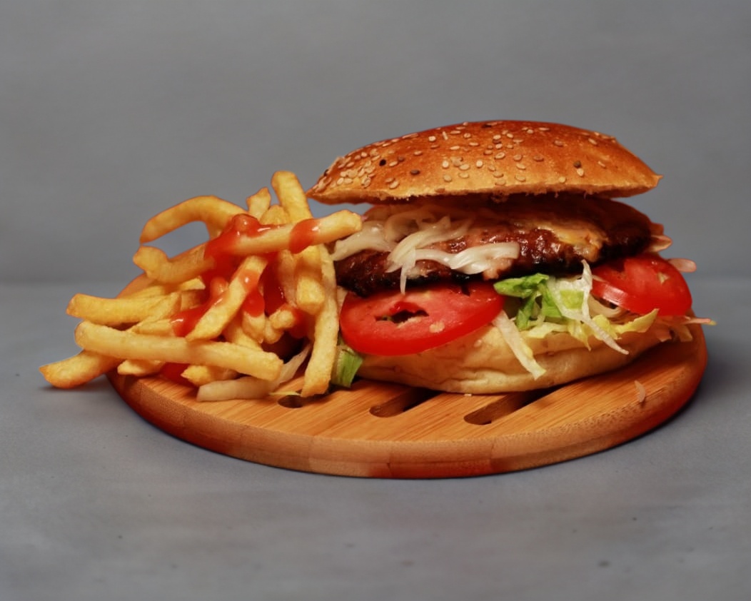 Pan, carne de res artesanal , queso tipo chihuahua, lechuga, tomate, mayonesa, mostaza, y cátsup, incluye una bolsita de chile serrano curtidos ( por separado).