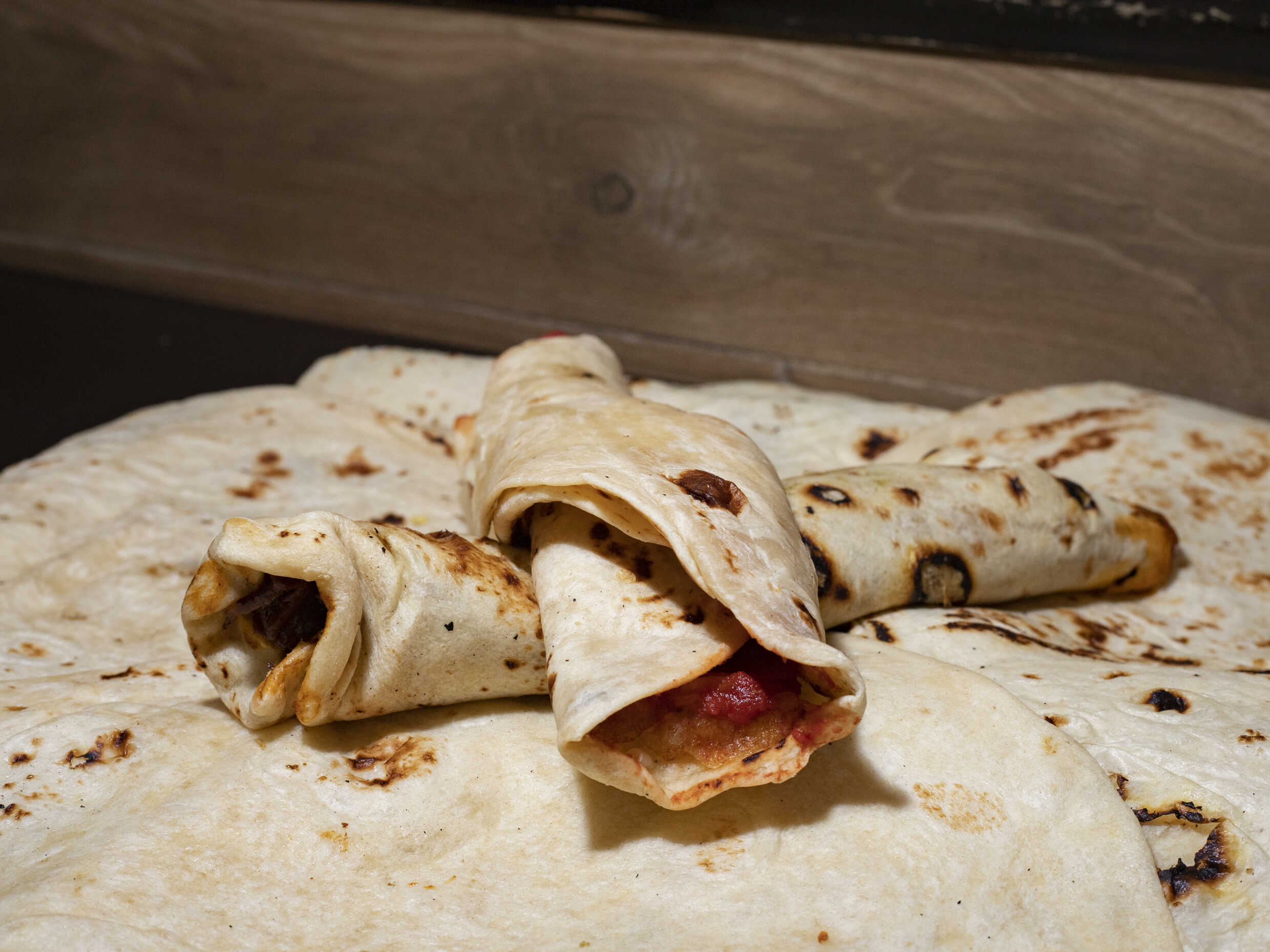 Burrito de tortilla de harina con chicharrón y salsa roja de tomate.