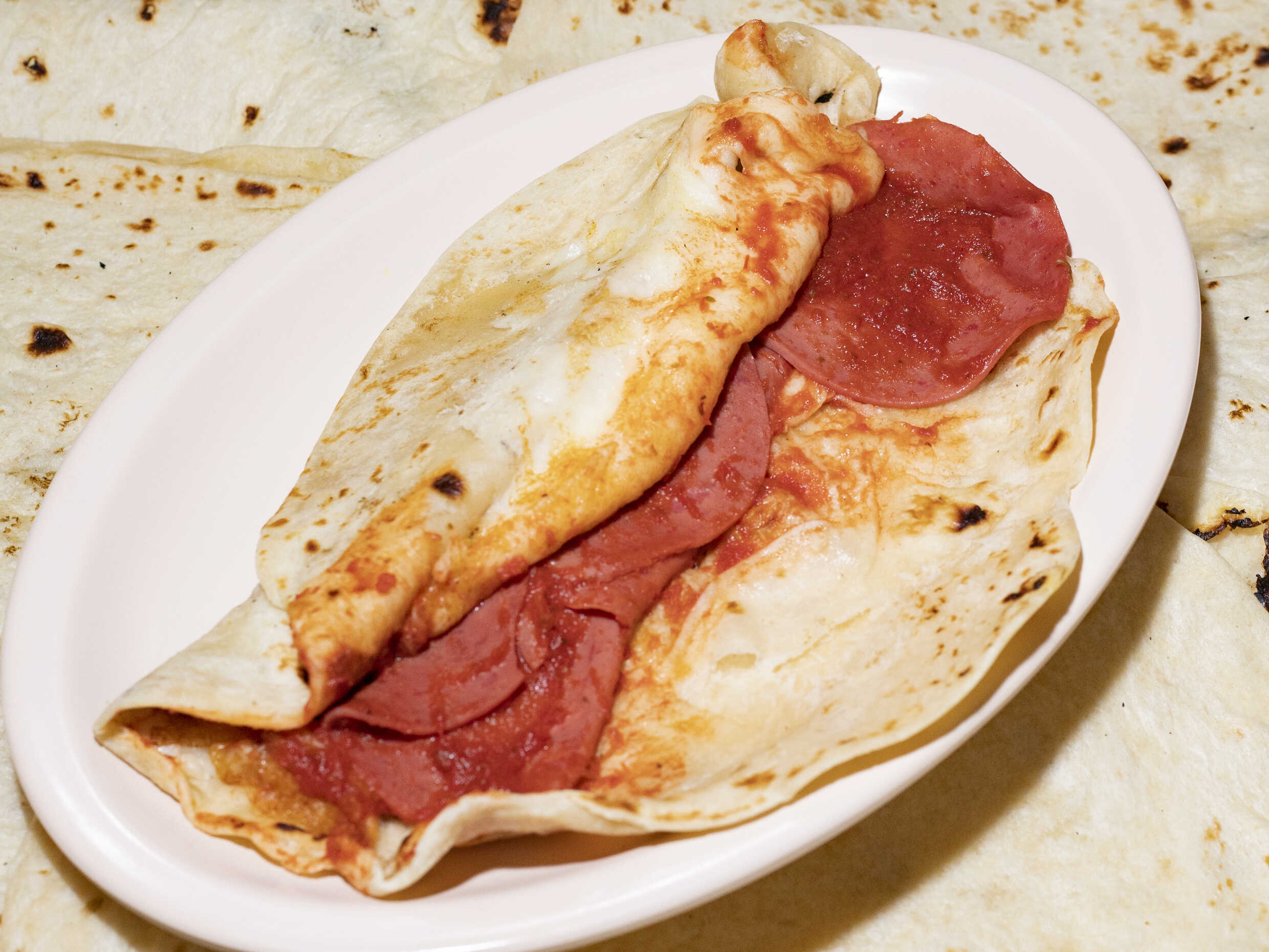 Burrito de tortilla de harina con pepperoni y queso.