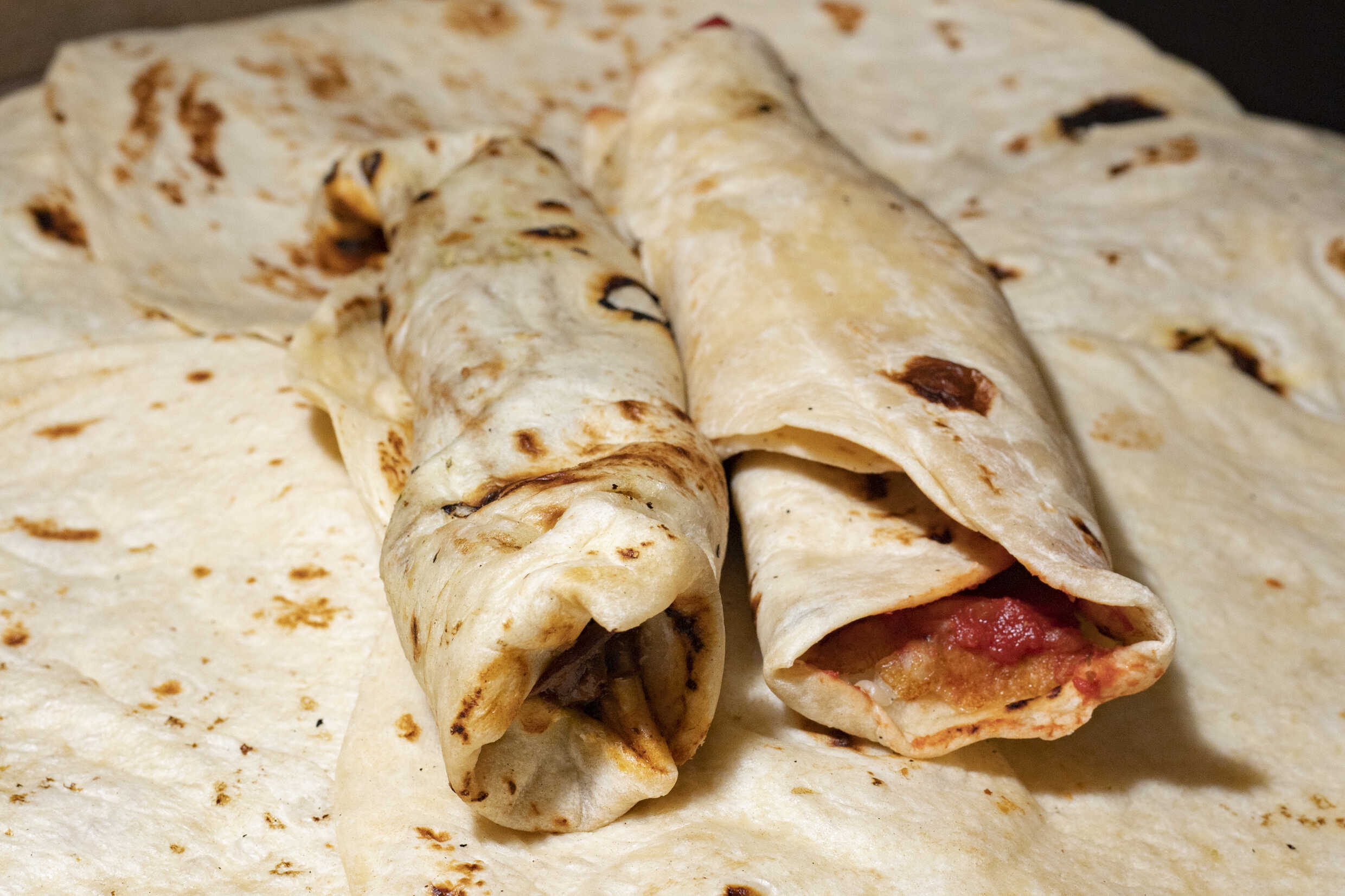 Burrito de tortilla de harina con carne deshebrada, papas y salsa de tomate.