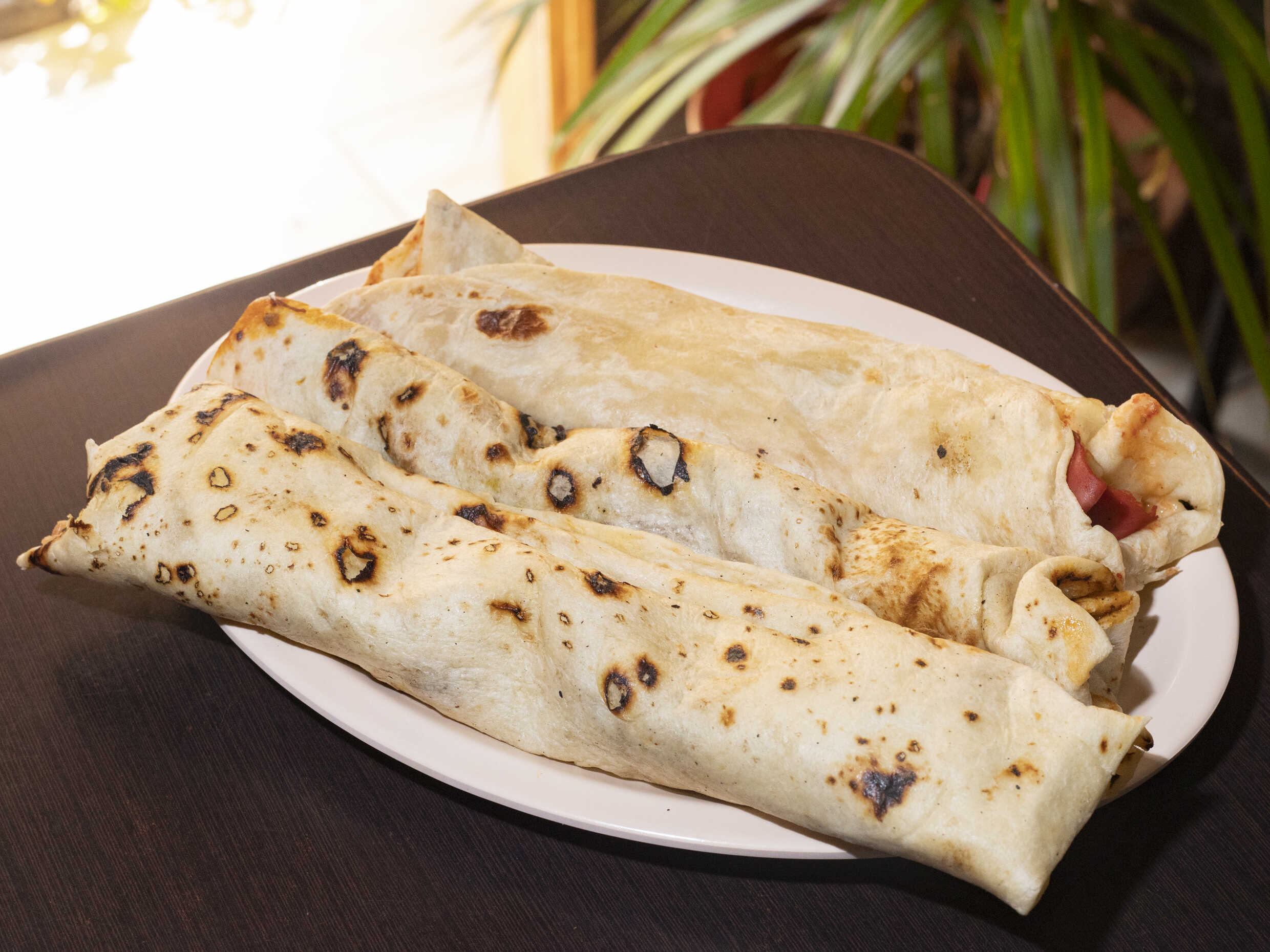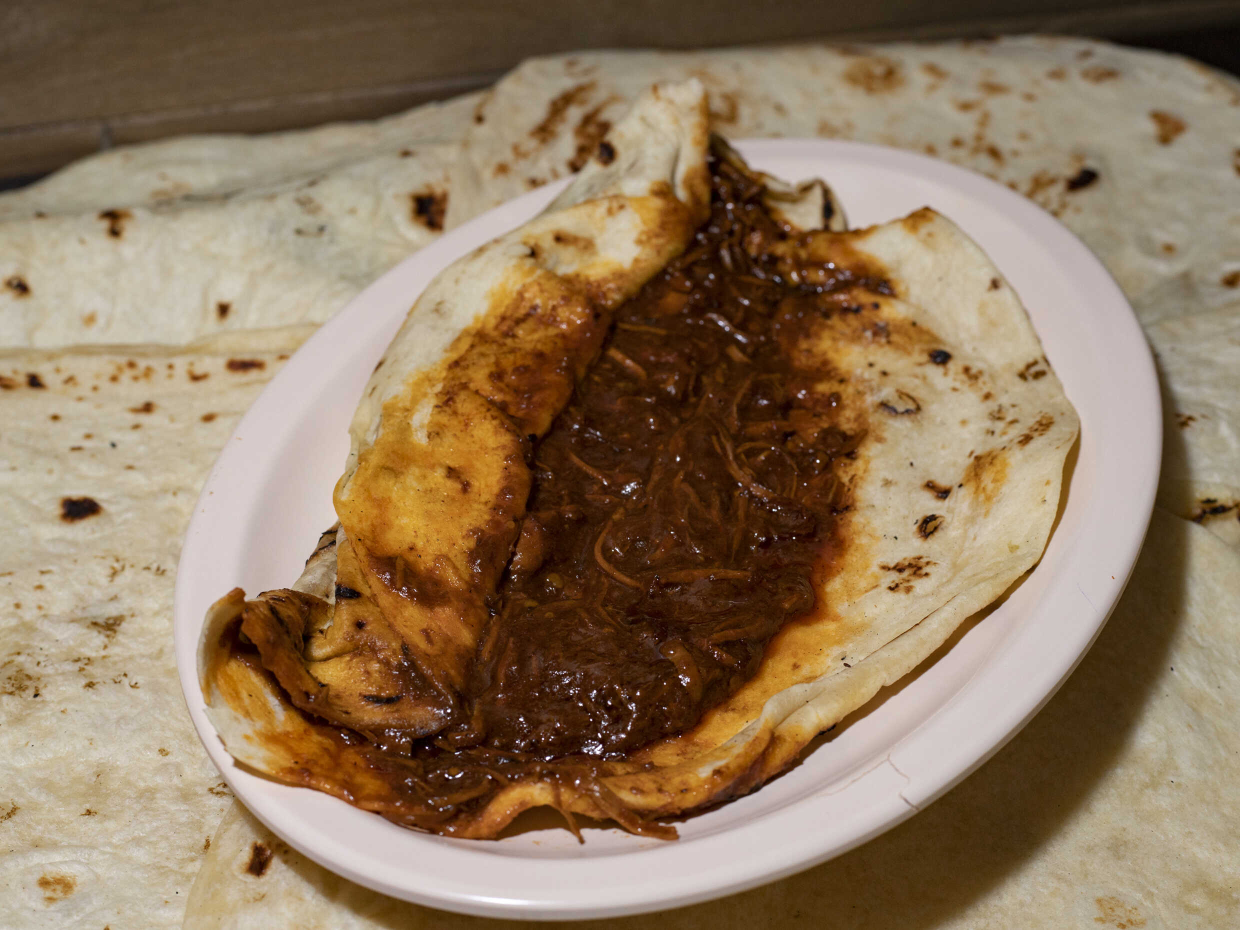 Burrito de tortilla de harina, con carne de puerco en asado de boda.
