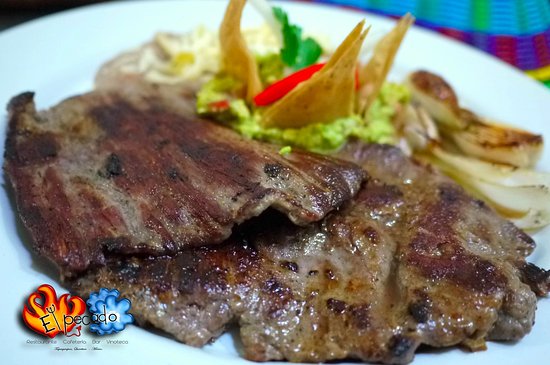 250 g De arrachera asada con guarnición de guacamole, quesadilla, salchicha y cebolla asada.