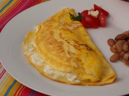 Huevo en torta relleno de queso y jamón con guarnición de frijoles refritos y porción de bolillo.