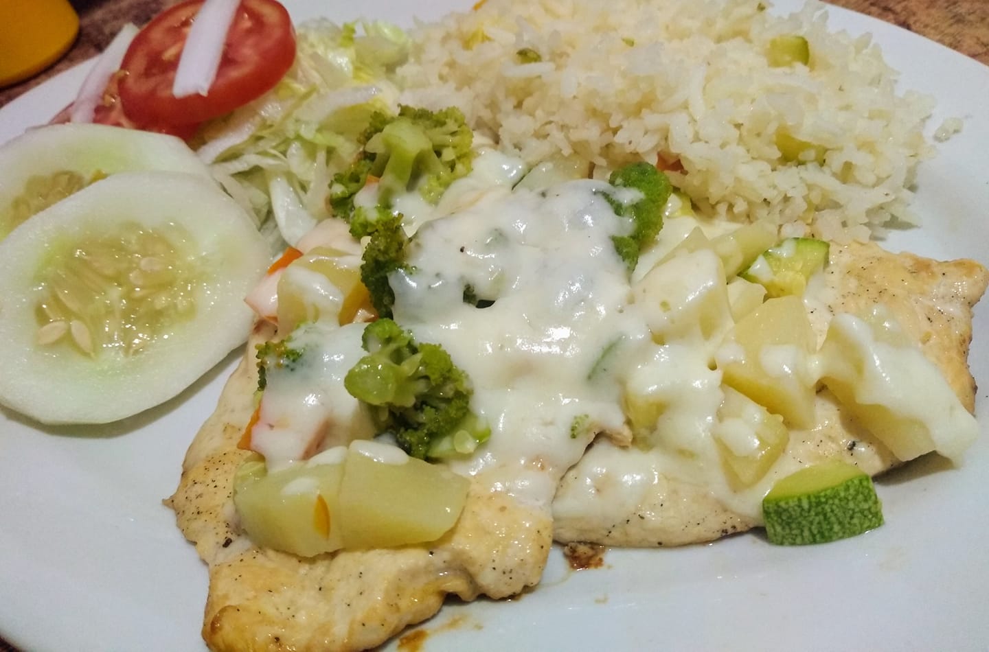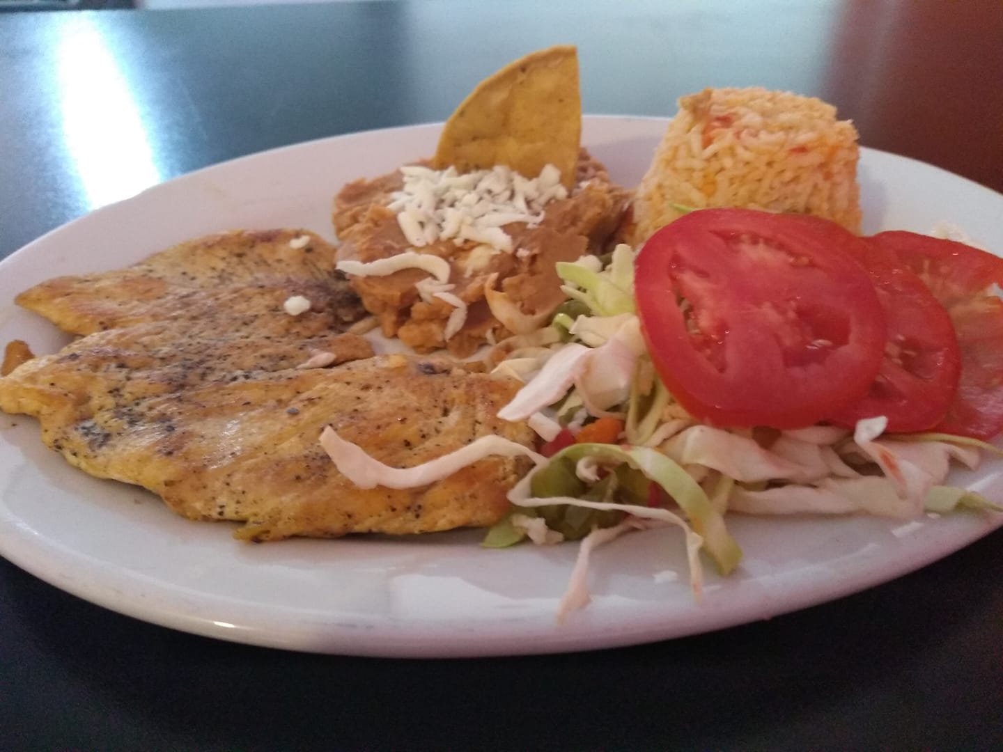 Filete de pollo o tilapia a la plancha con guarnición de arroz y ensalada.