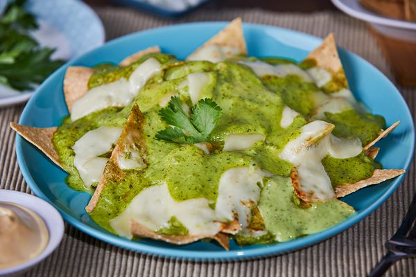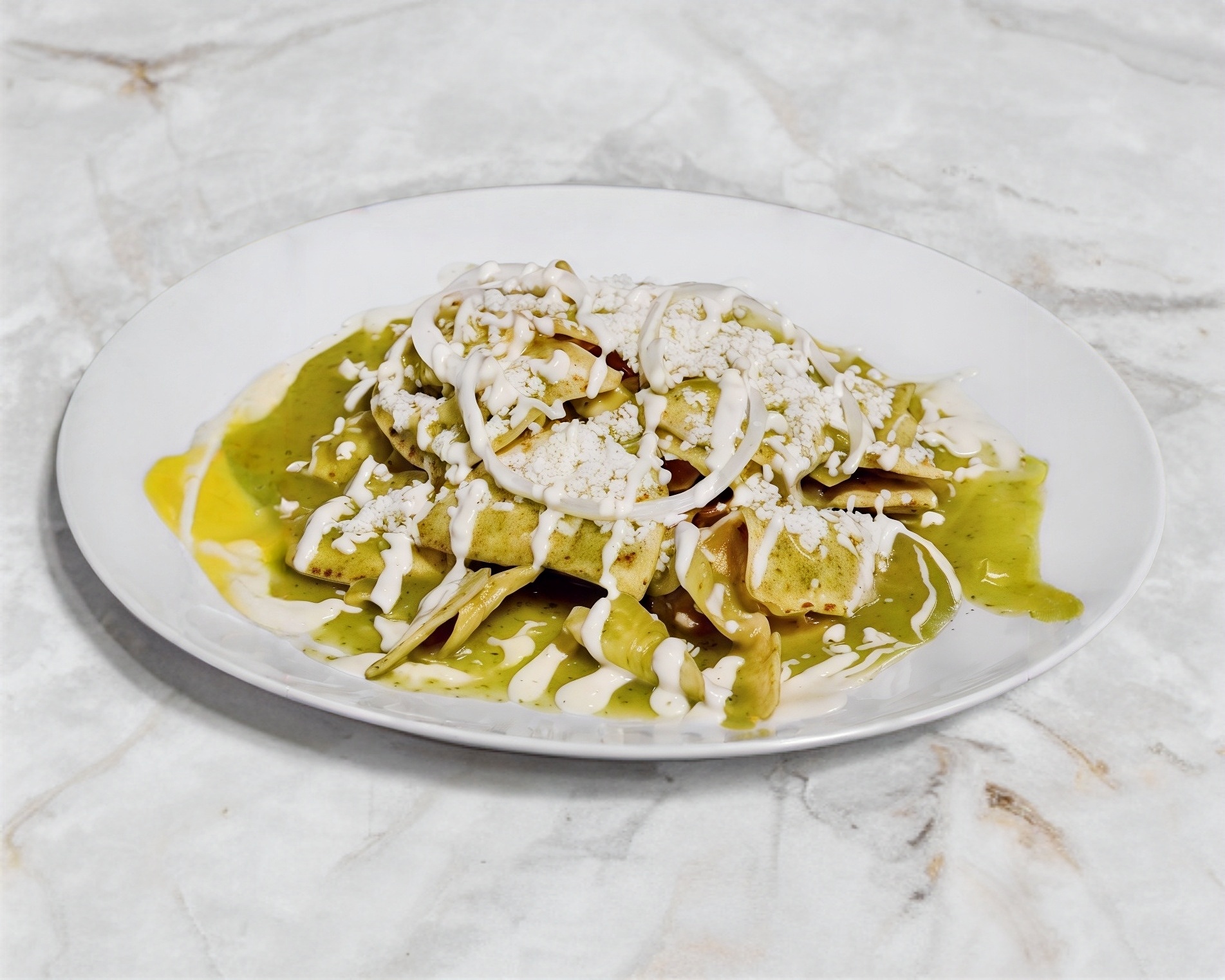 Chilaquiles bañados en una deliciosa salsa de tomatillo asado (sala ,frijoles y porción).