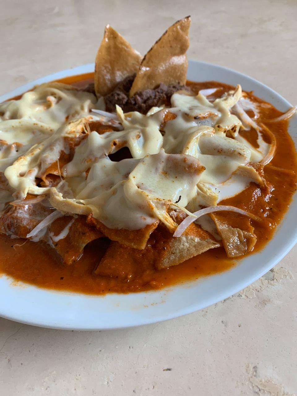 Porción de chilaquiles en salsa del día, acompañados de frijoles y bolillo, sin huevo.