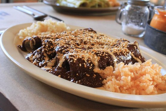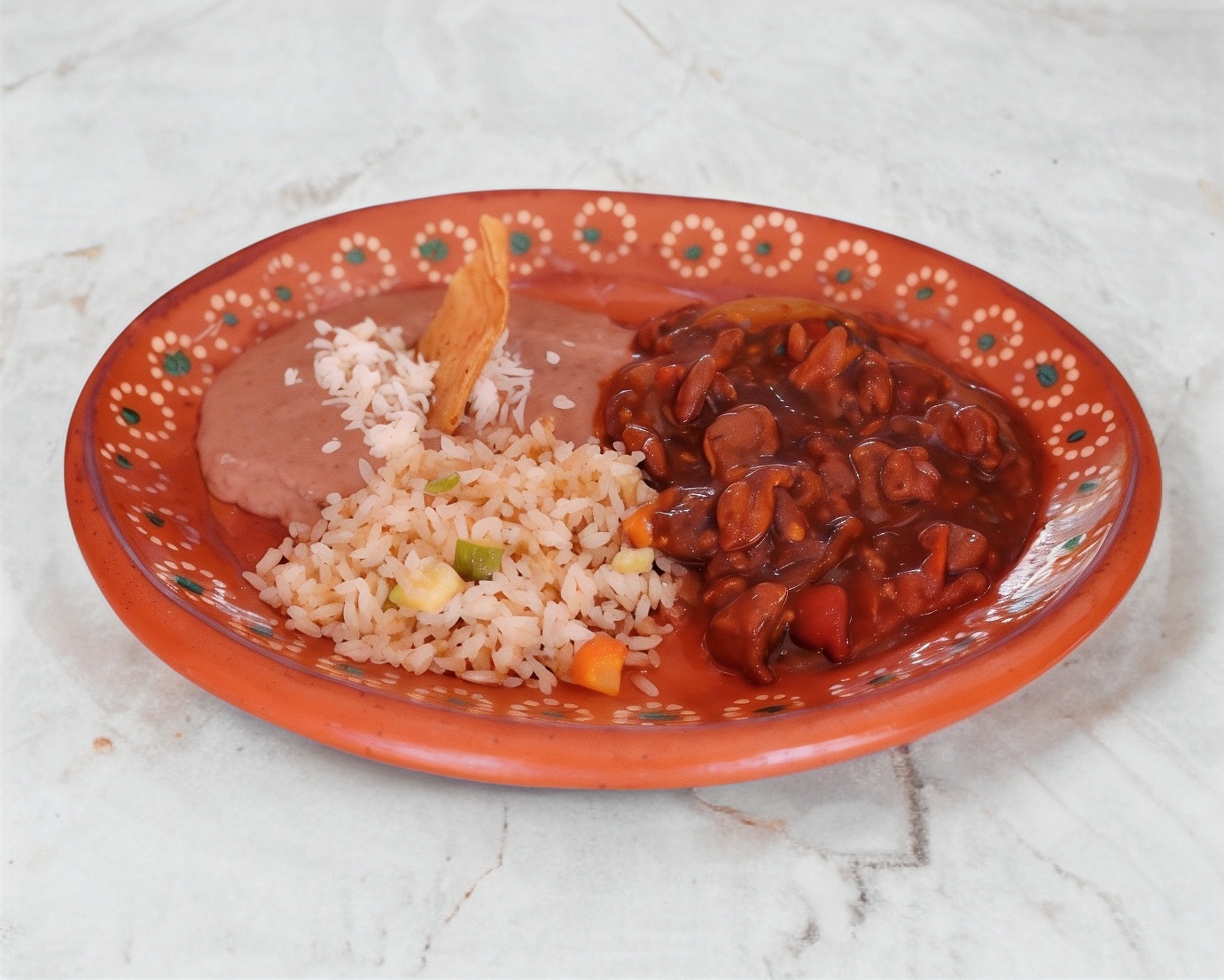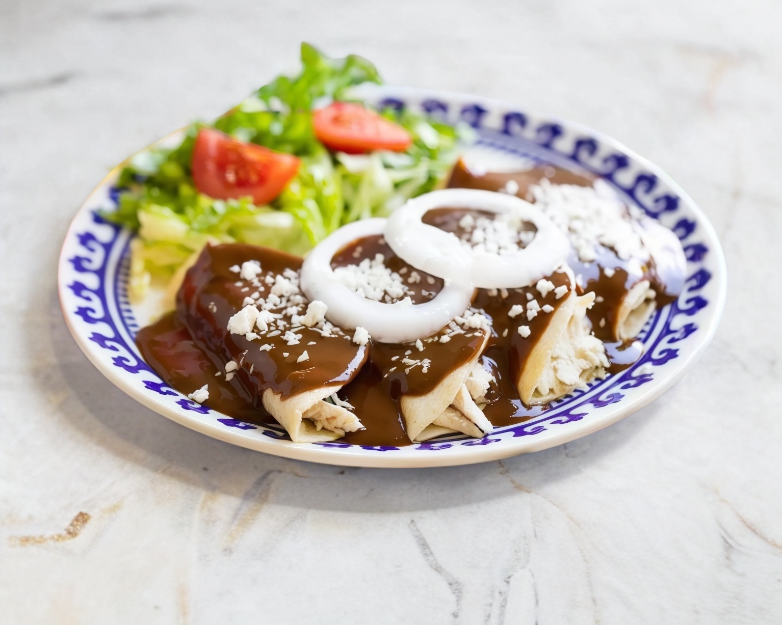 Cuatro piezas de enchiladas rellenas de pollo o queso, bañadas en una salsa tipo mole al chocolate, acompañadas de frijoles, arroz y ensalada.