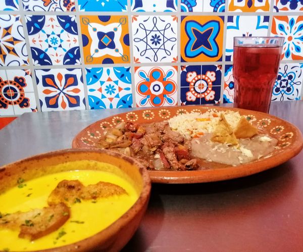 Entrada que consta de sopa o crema; plato fuerte con la pieza de proteína de tu elección, acompañada de frijoles, arroz y ensalada; postre y un vaso de agua fresca de fruta (incluye tortillas o un bolillo).