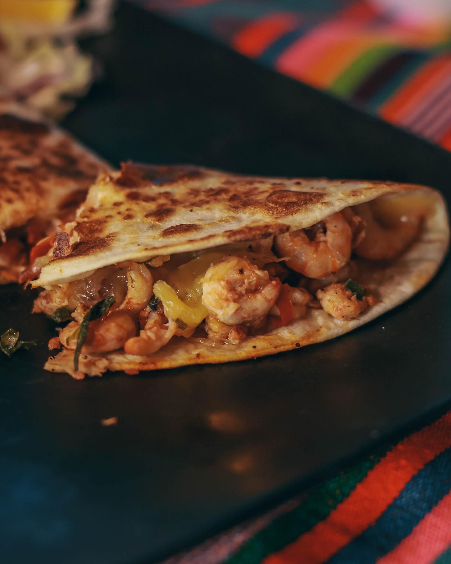 Tortilla de harina rellena de 200 g de camarones salteados, ensalada y aderezo de aguacate, acompañada de 150 g de papas a la francesa.