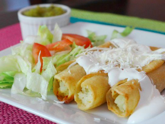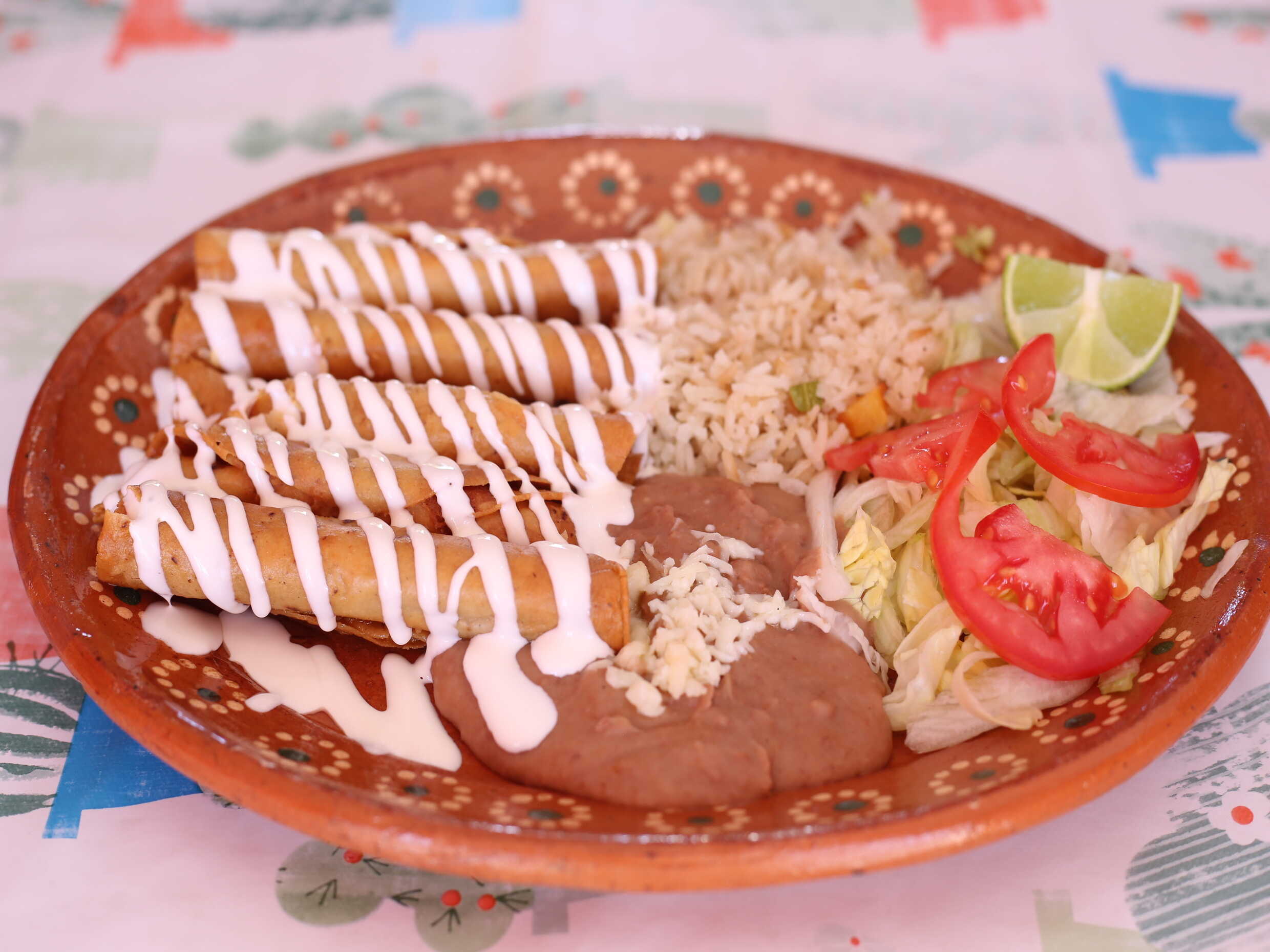 5 Piezas de flautas de pollo o carne deshebrada acompañadas de frijoles, arroz y ensalada.