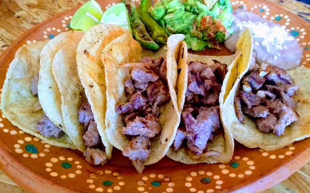 Cinco tacos de arrachera en tortilla grande, acompañados de guacamole y cebolla asada.