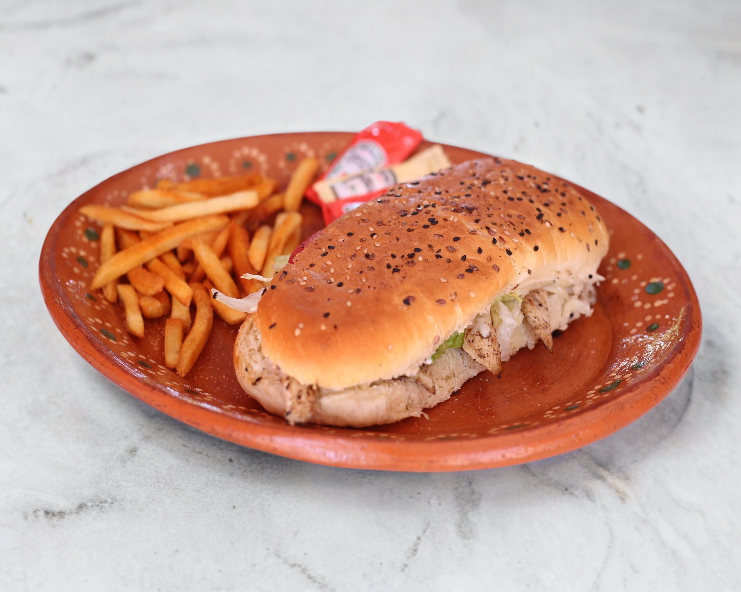 Emparedado de pollo a la plancha, con aderezo de aguacate, ensalada y porción de papas fritas (70 g).