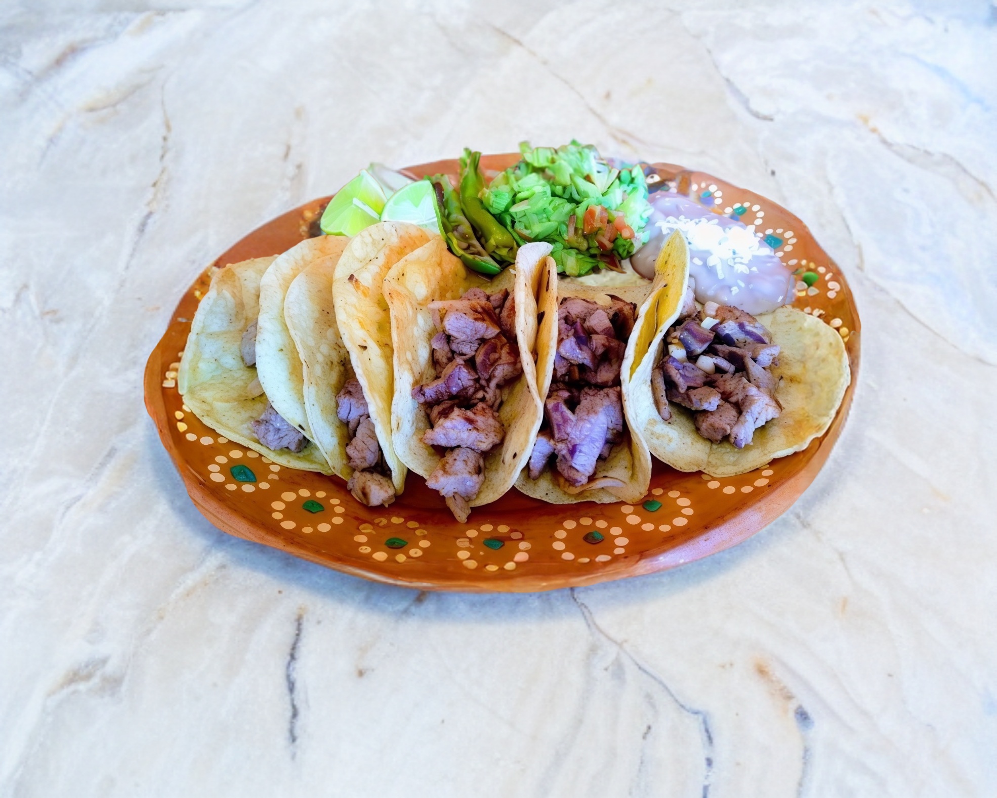 250 De arrachera asada en tortilla chica, acompañados de salsa y verdura.
