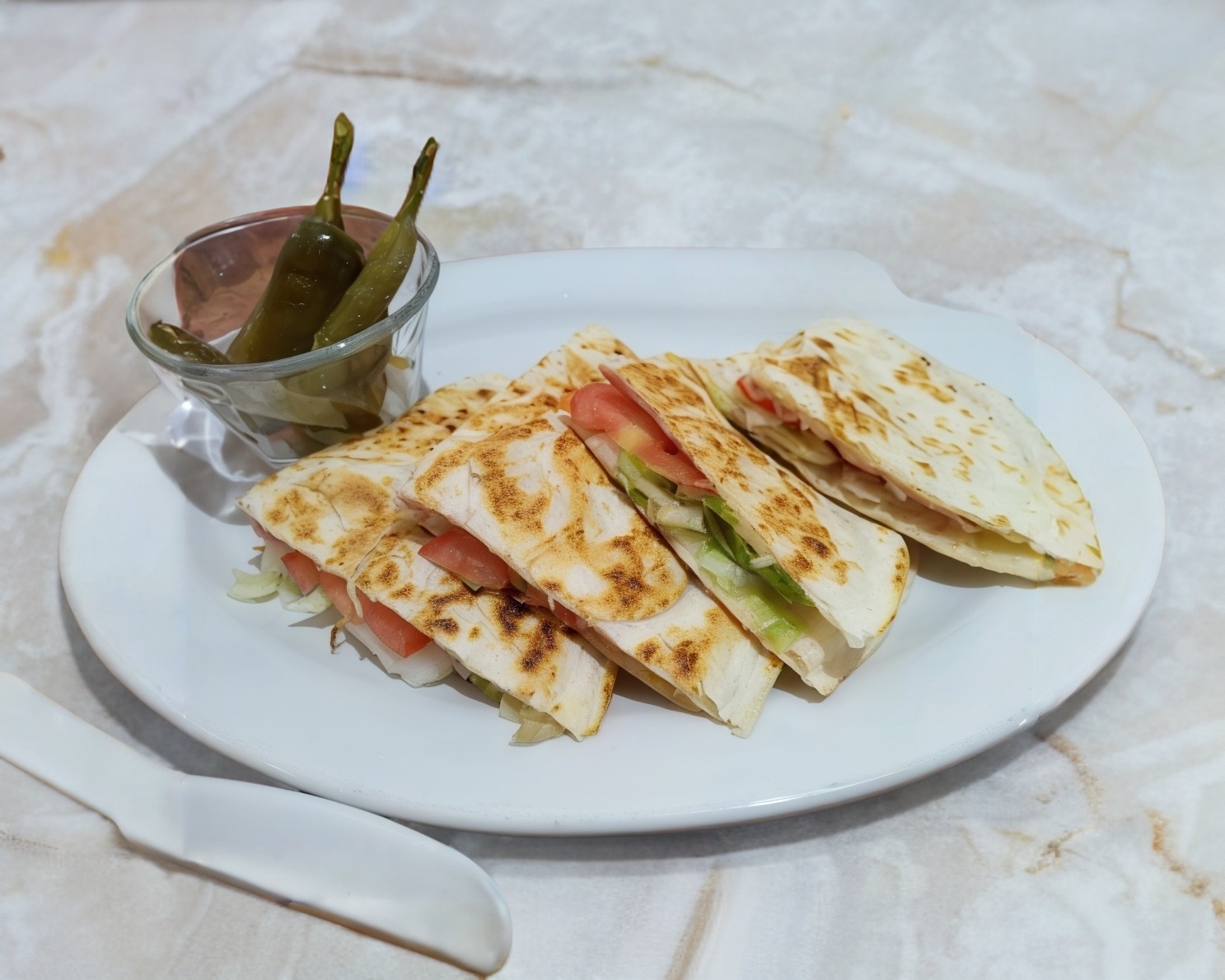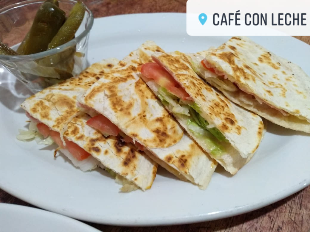Doble tortilla de harina rellena de queso, aguacate, jamón, lechuga y jitomate.