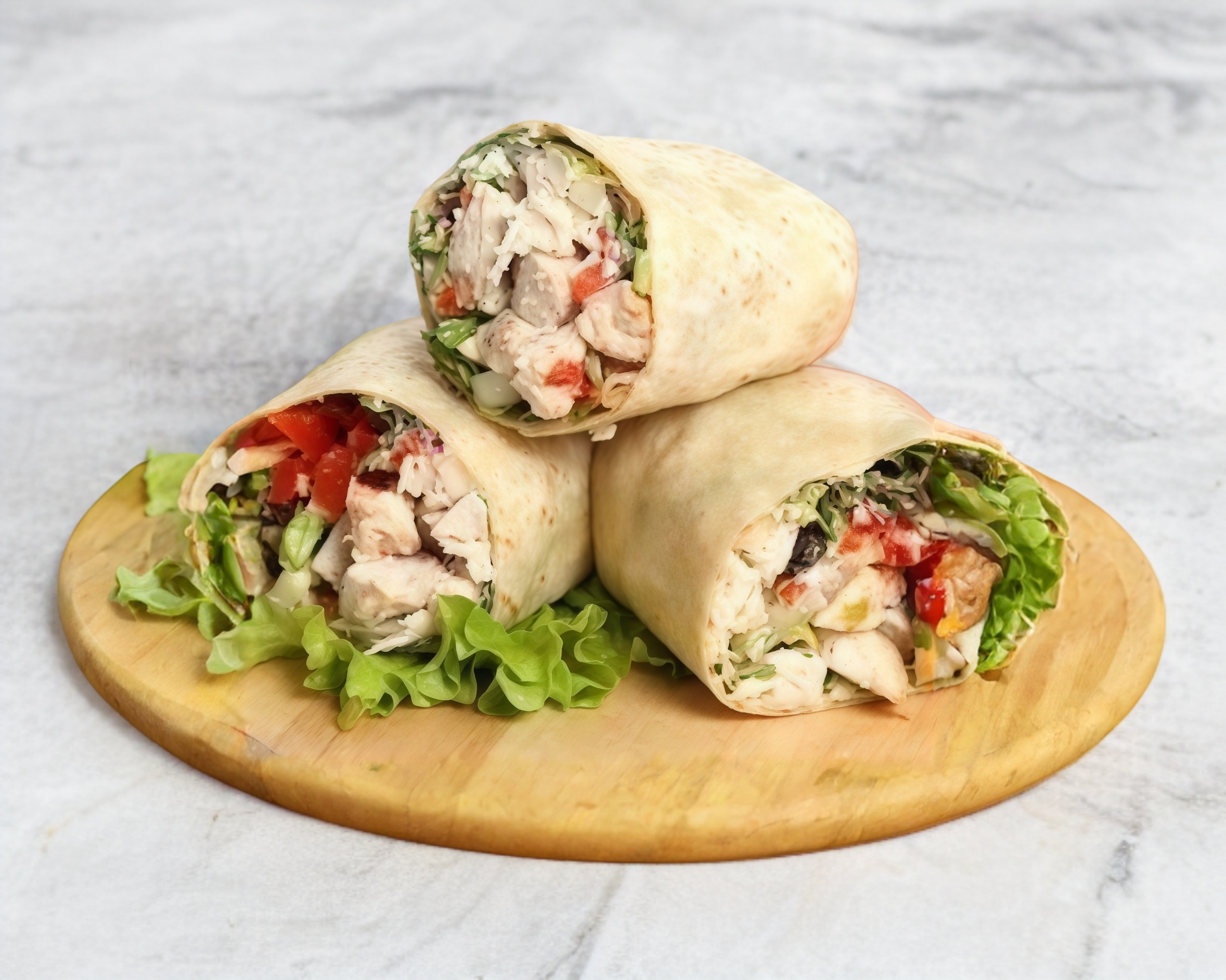 Tortilla de harina rellena de 150g de pollo a la plancha, ensalada y aderezo cesar, acompañada de 150 g de papas a la francesa.