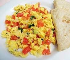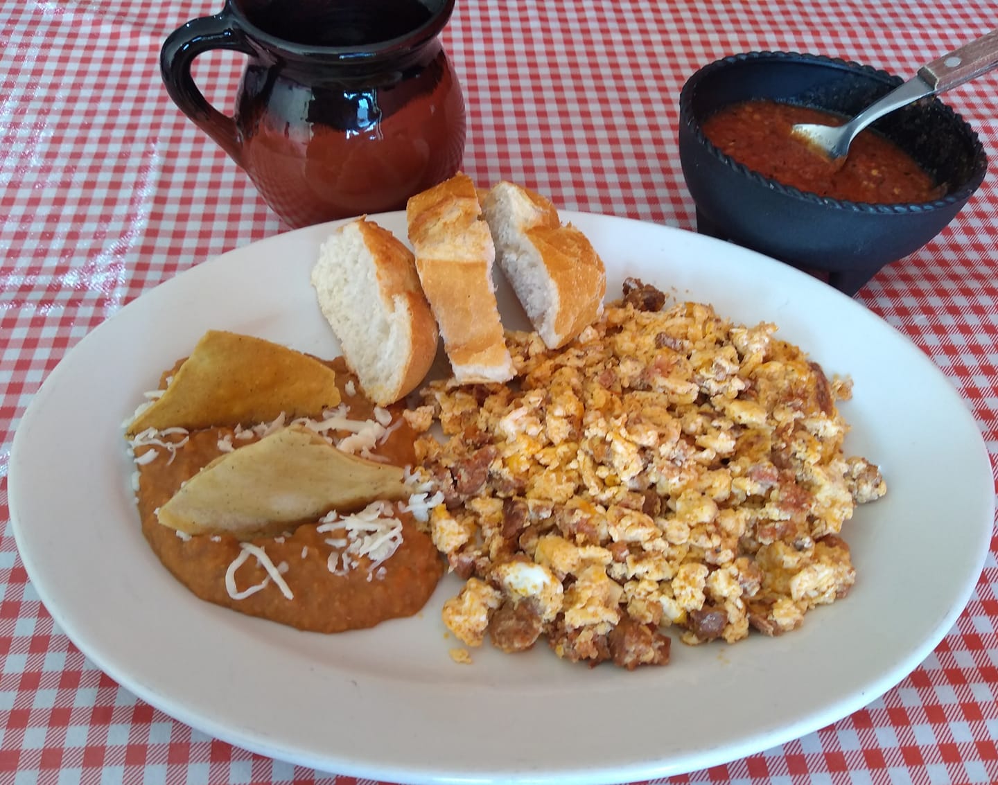 Tradicionales huevos revueltos con pico de gallo, con guarnición de frijoles refritos y porción de bolillo.