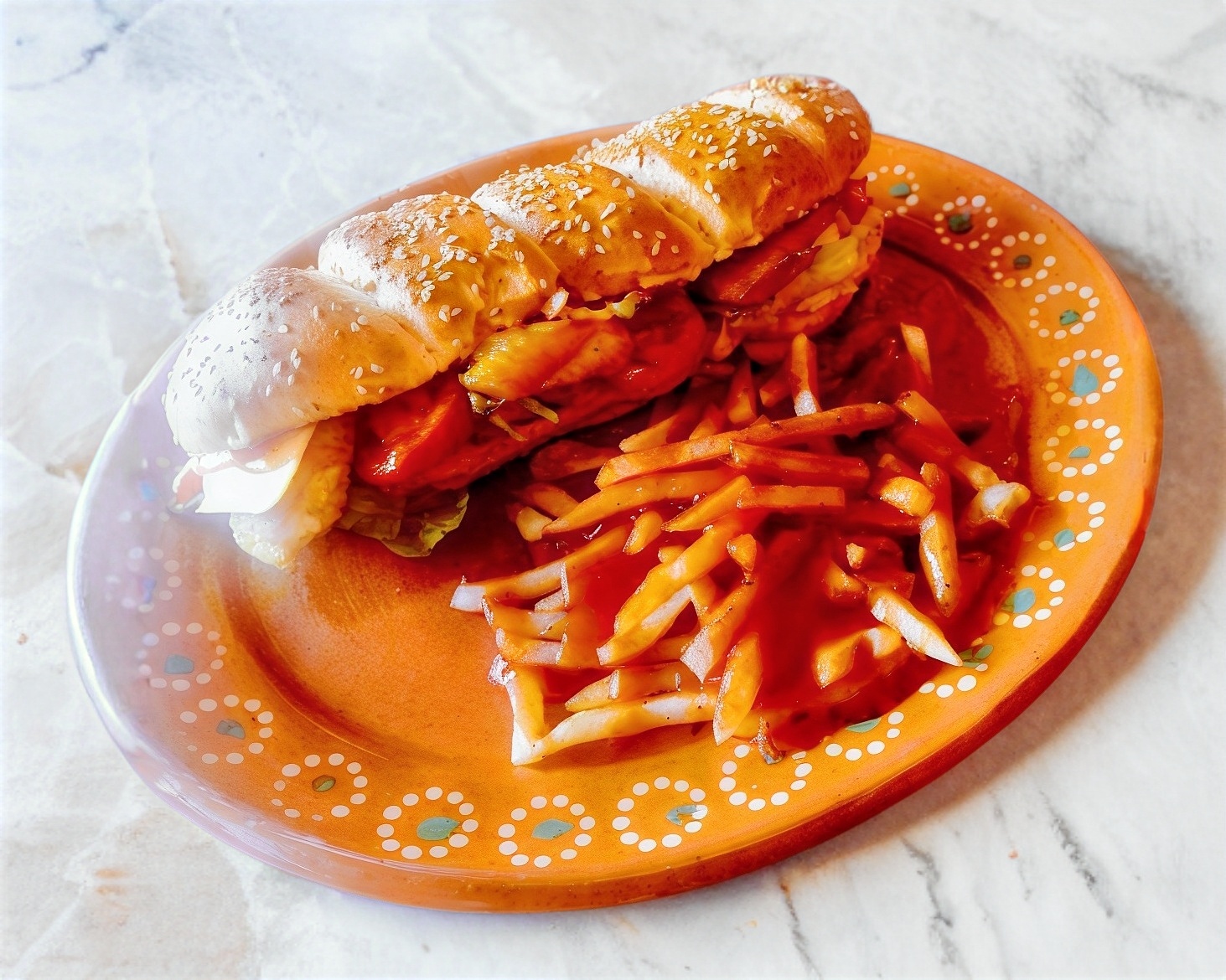 Tradicional hamburguesa americana con una rica porción de carne, queso, jamón y verdura, acompañada de papas a la francesa.