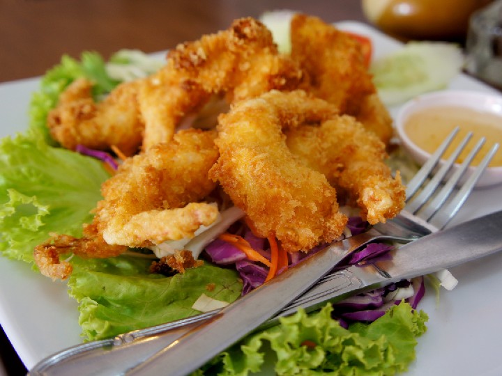 Orden de 12 camarones empanizados con guarnición de arroz y ensalada, acompañado de bolillo y aderezo aurora.