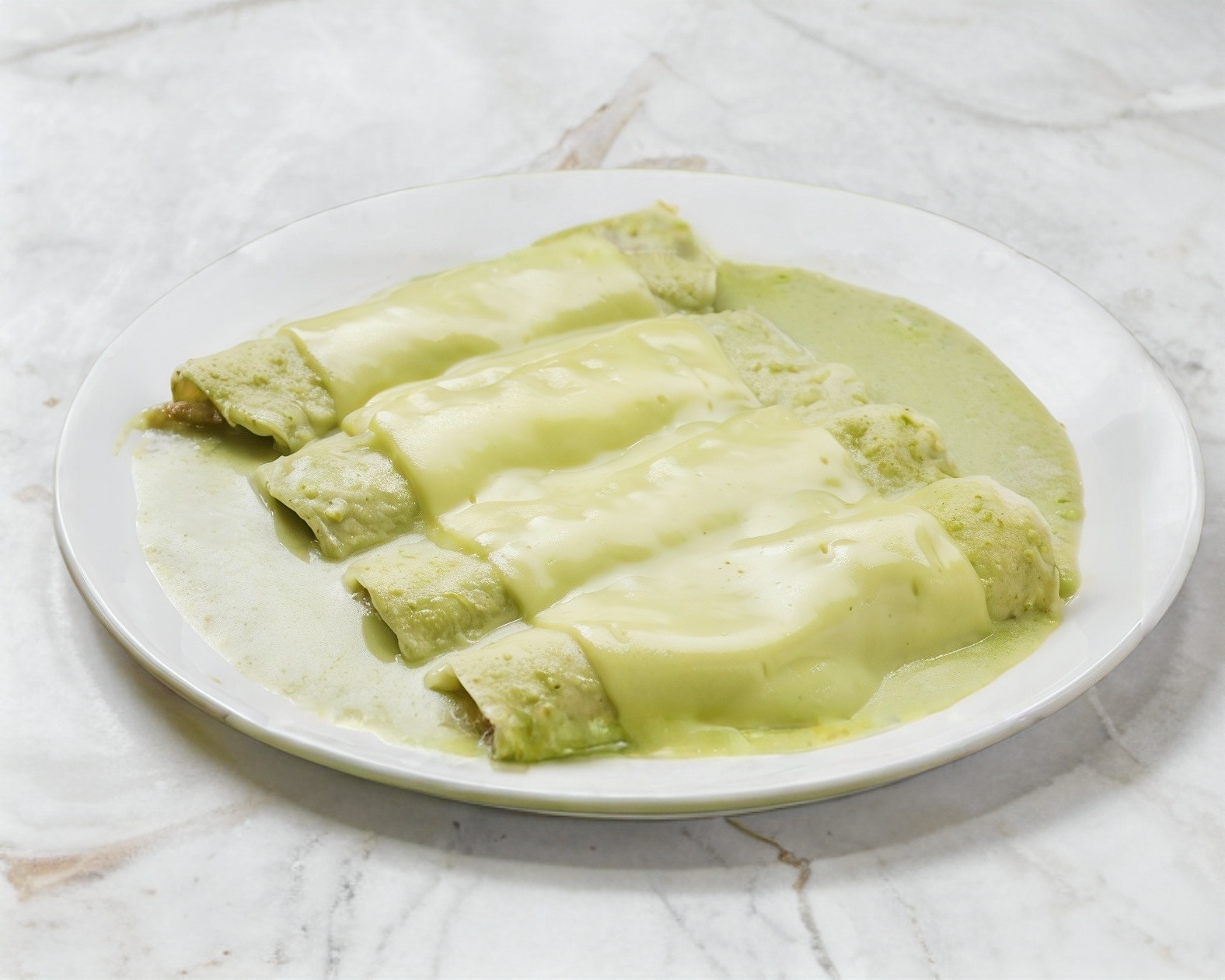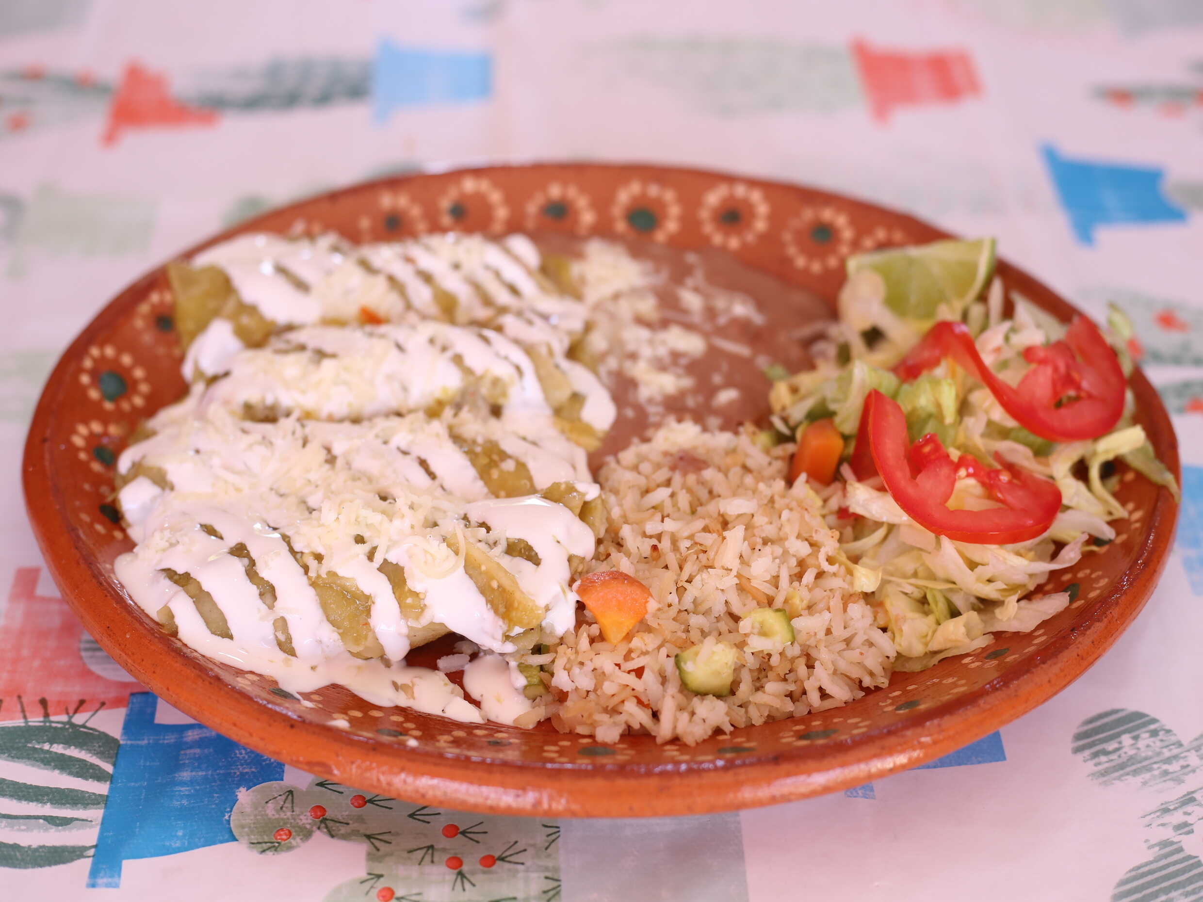 Tradicionales enchiladas verdes rellenas de pollo o queso, bañadas en salsa verde de tomatillo o chila ancho asado acompañadas de frijoles, arroz y ensalada.