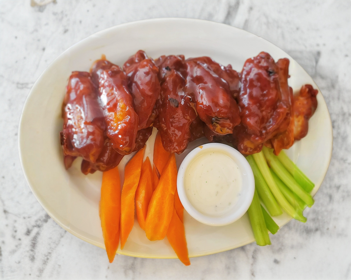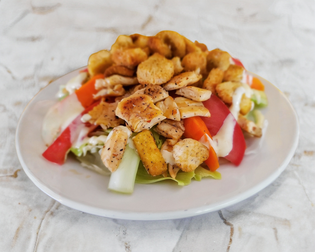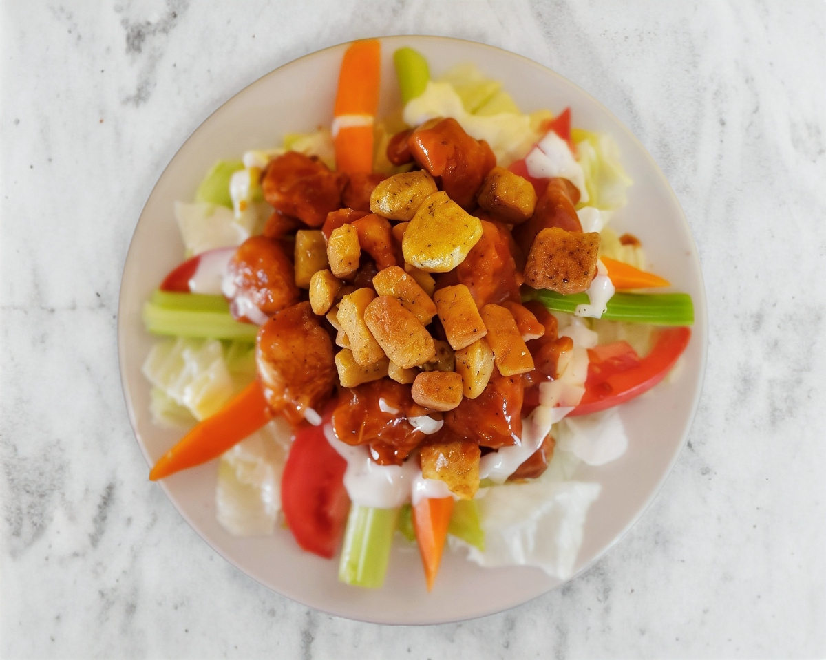 Combinación de lechuga, apio, zanahoria, pechuga de pollo empanizada bañada en salsa de alitas, crotones y aderezo ranch