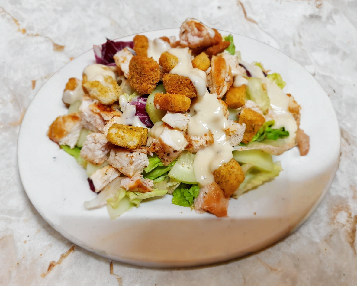 Combinación de luechuga, apio, zanahoria, pechuga de pollo a la plancha, crotones y aderezo cesar