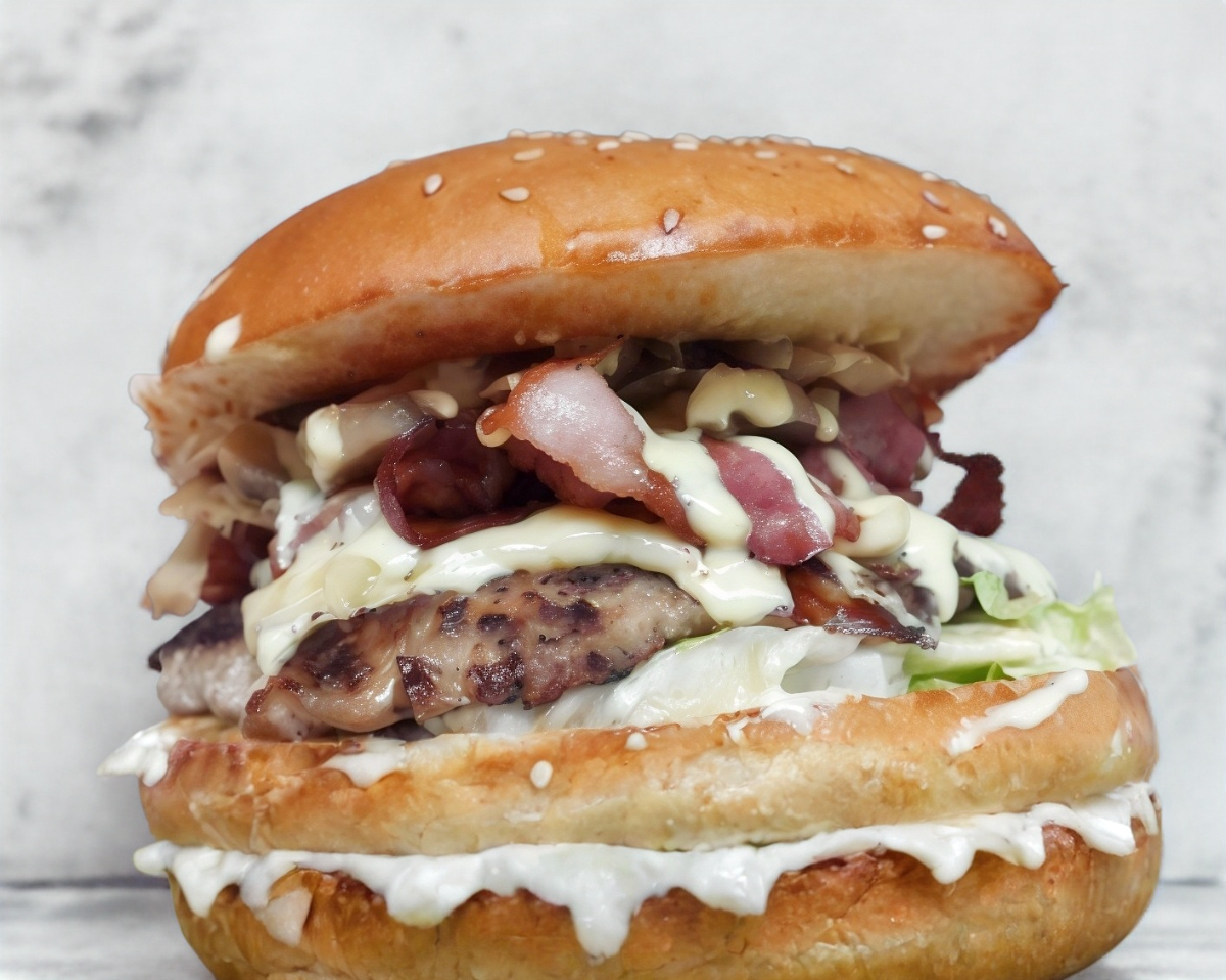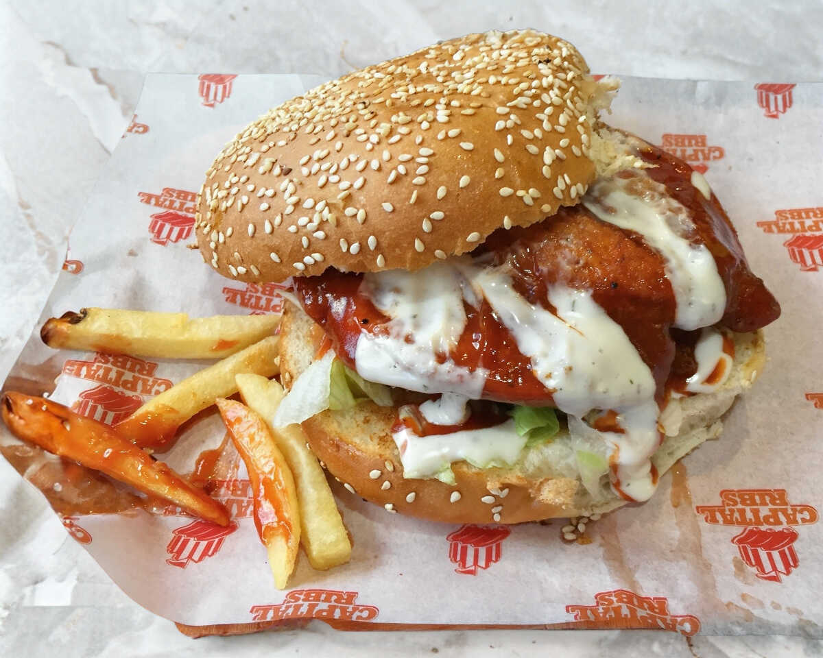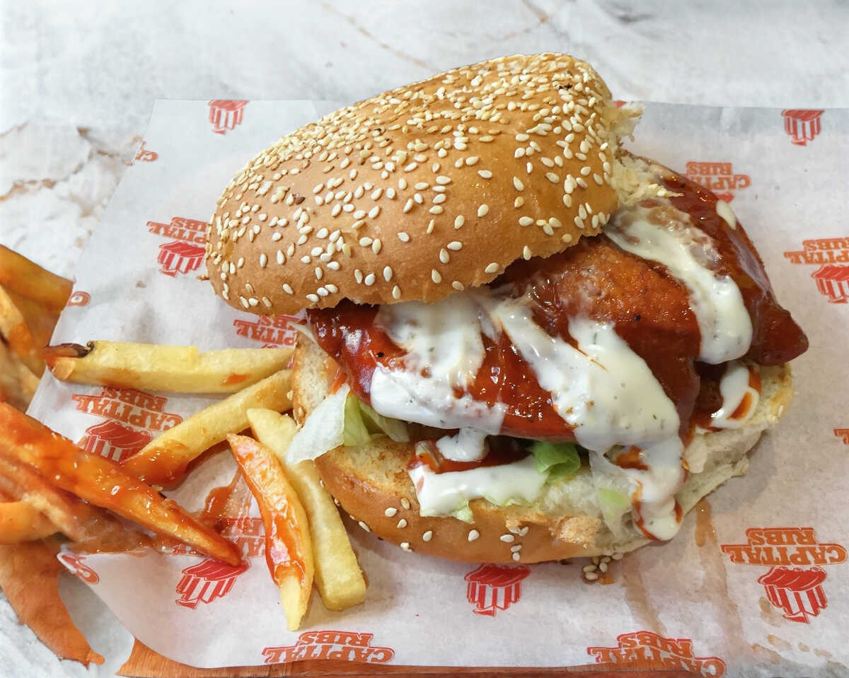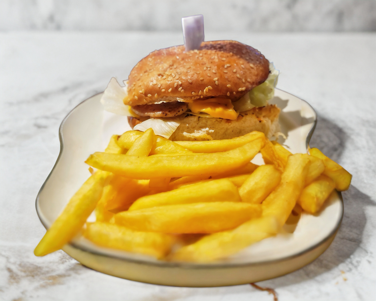 Hamburguesa 150gr de pechuga de pollo con empanizado picosito gringo, ensalada de col, pepinillos y papas francesas