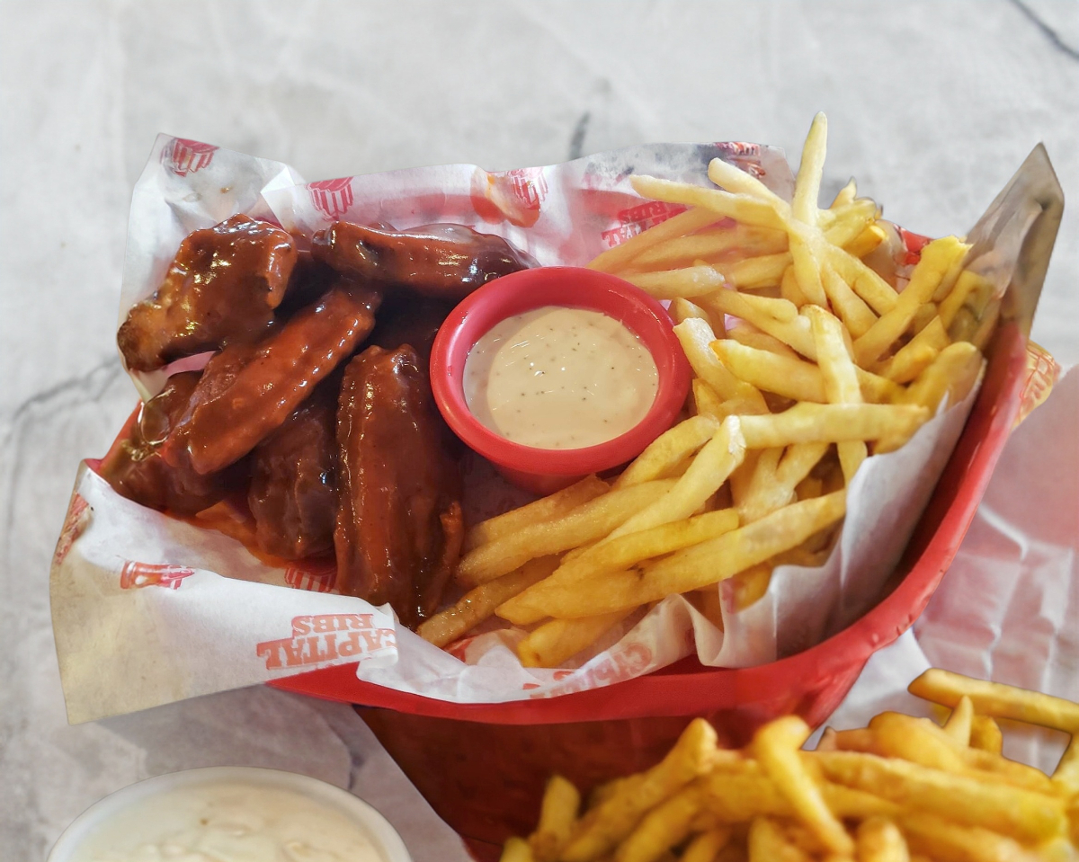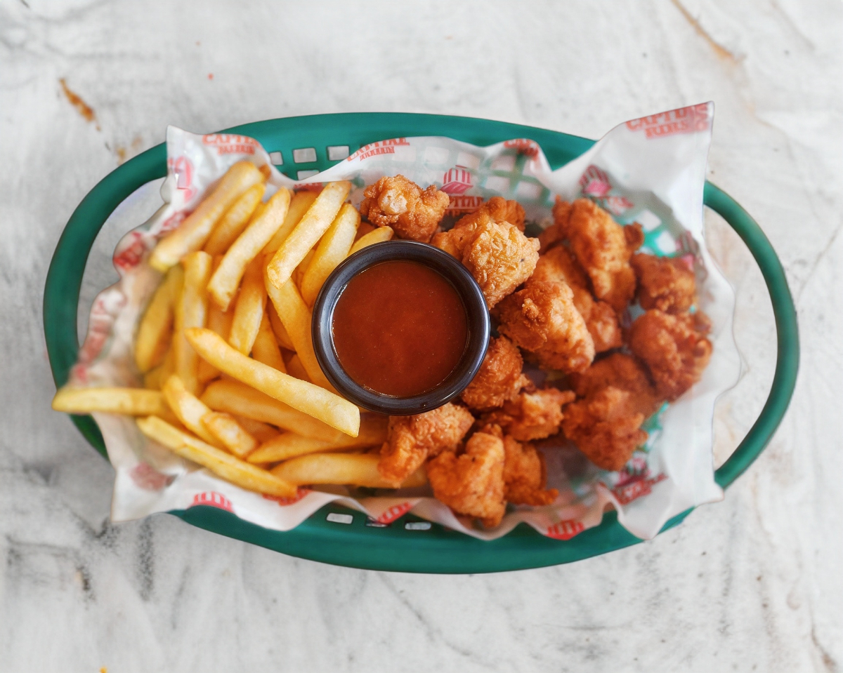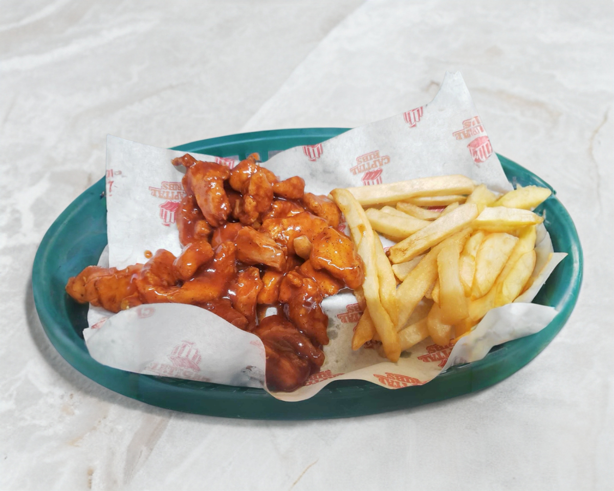 200gr de boneles bañados en tu salsa predilecta con 150grs de papas francesas.