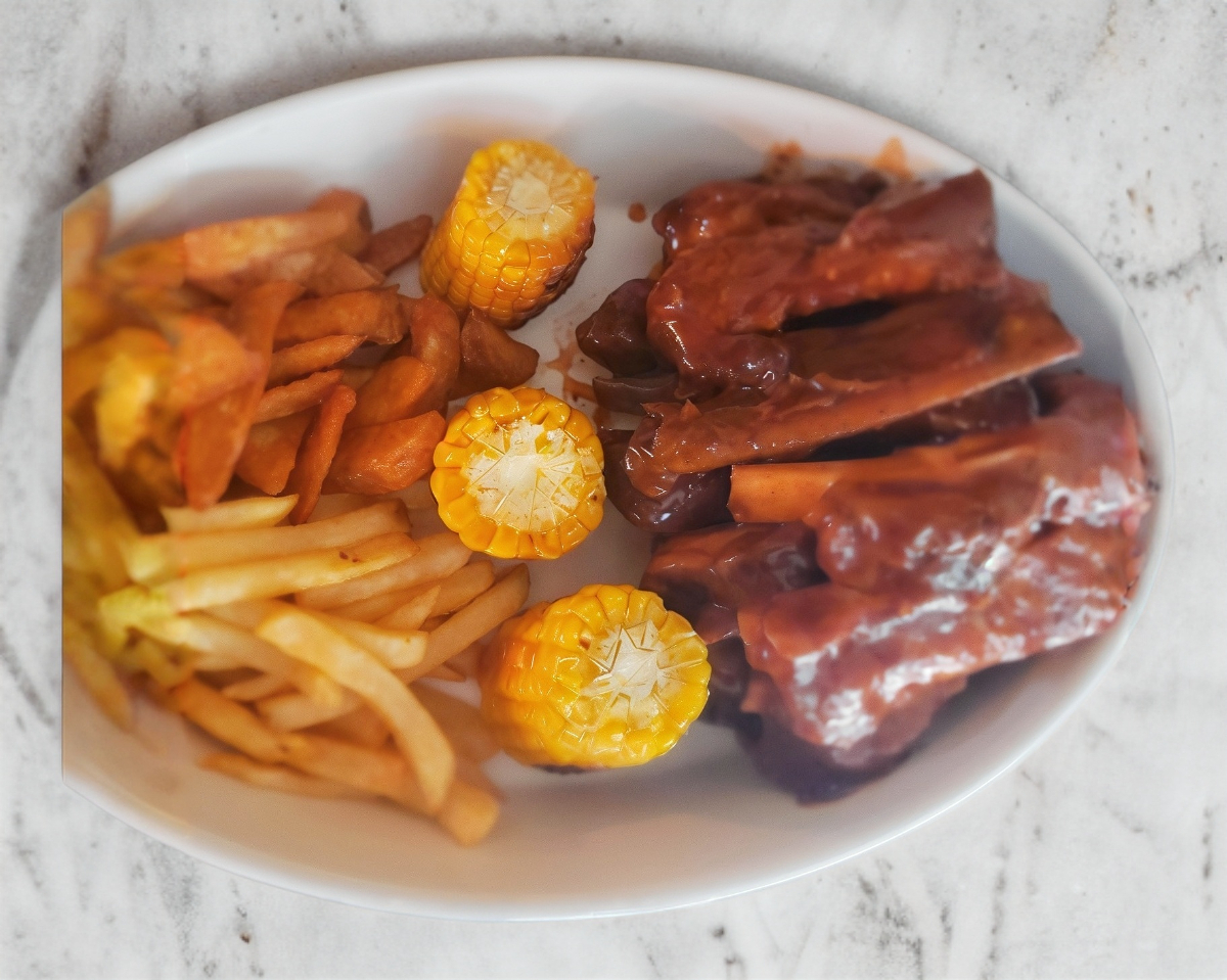 1/3 Costillas BBQ, Papas Francesas y Elote Dulce