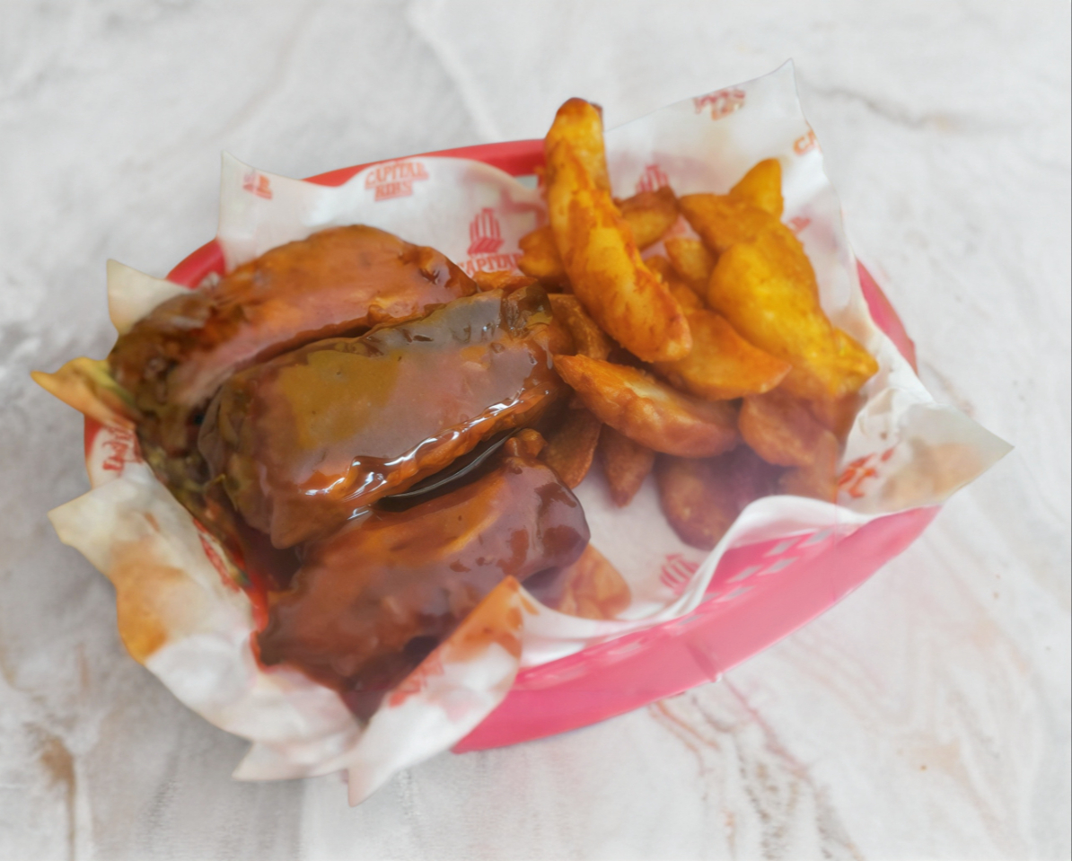 (300grs) de costilla baby back ahumada con 150grs de papas gajo. Para 1 persona.