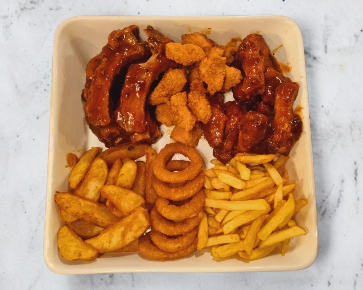 300 grs de Costilla Baby Back.*1 + 8 Alitas.*1 + 200 grs de Boneless.*1 + 150 grs de Papas Gajo.*1 + 150 grs de Papas Francesas.*1 + 6 Aros de Cebolla.*1